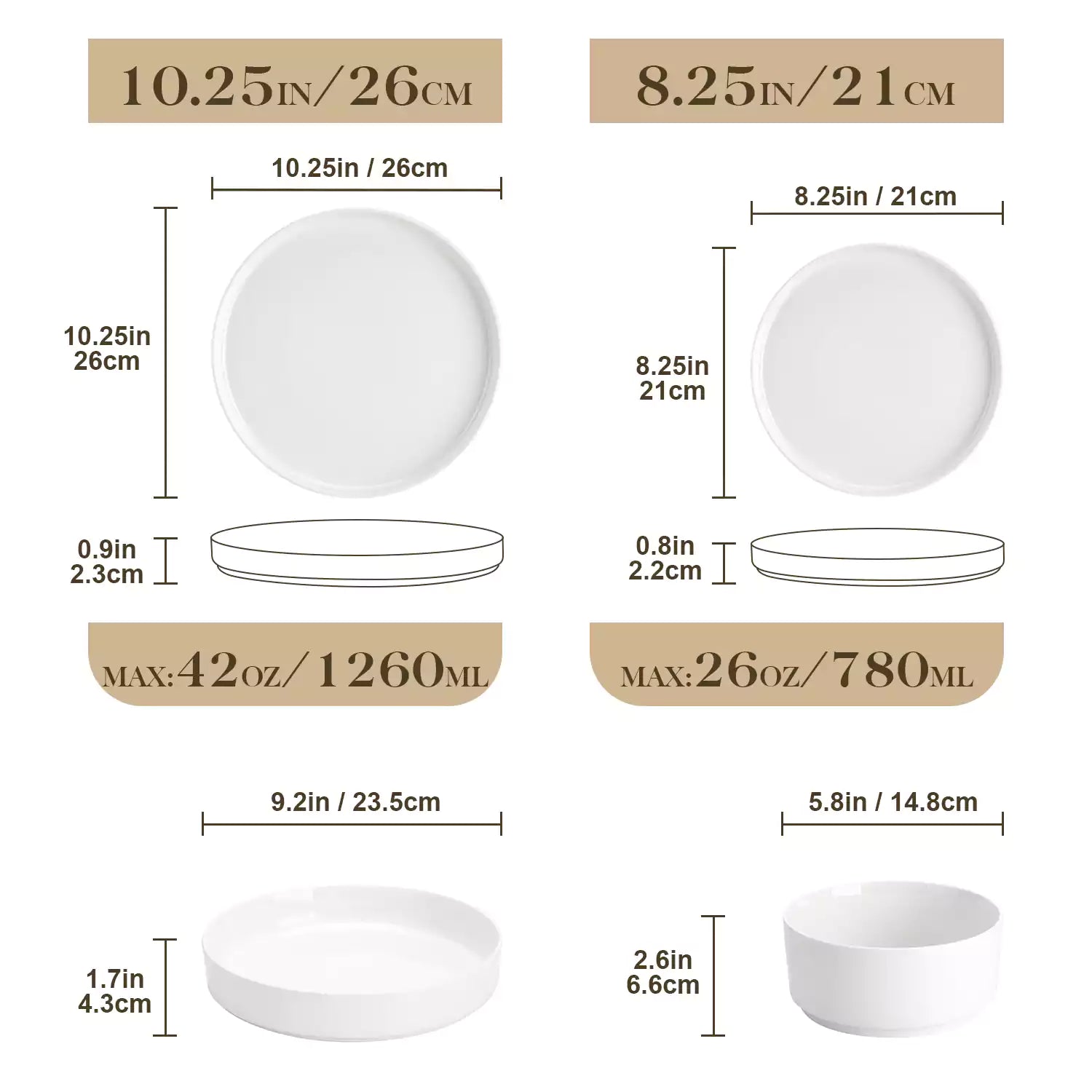 This versatile 8-person dinnerware set, available in ivory white or with a black trim, includes dinner plates, salad plates, pasta bowls, and cereal bowls. With sleek lines and straight edges, each piece offers a modern twist on a classic design. The elevated, non-slip bases ensure a secure grip, making it suitable for both indoor and outdoor use. Made from durable porcelain, this set is microwave, dishwasher, and oven safe, and stacks easily for convenient storage. Its neutral tones complement and enhance the presentation of any dish.