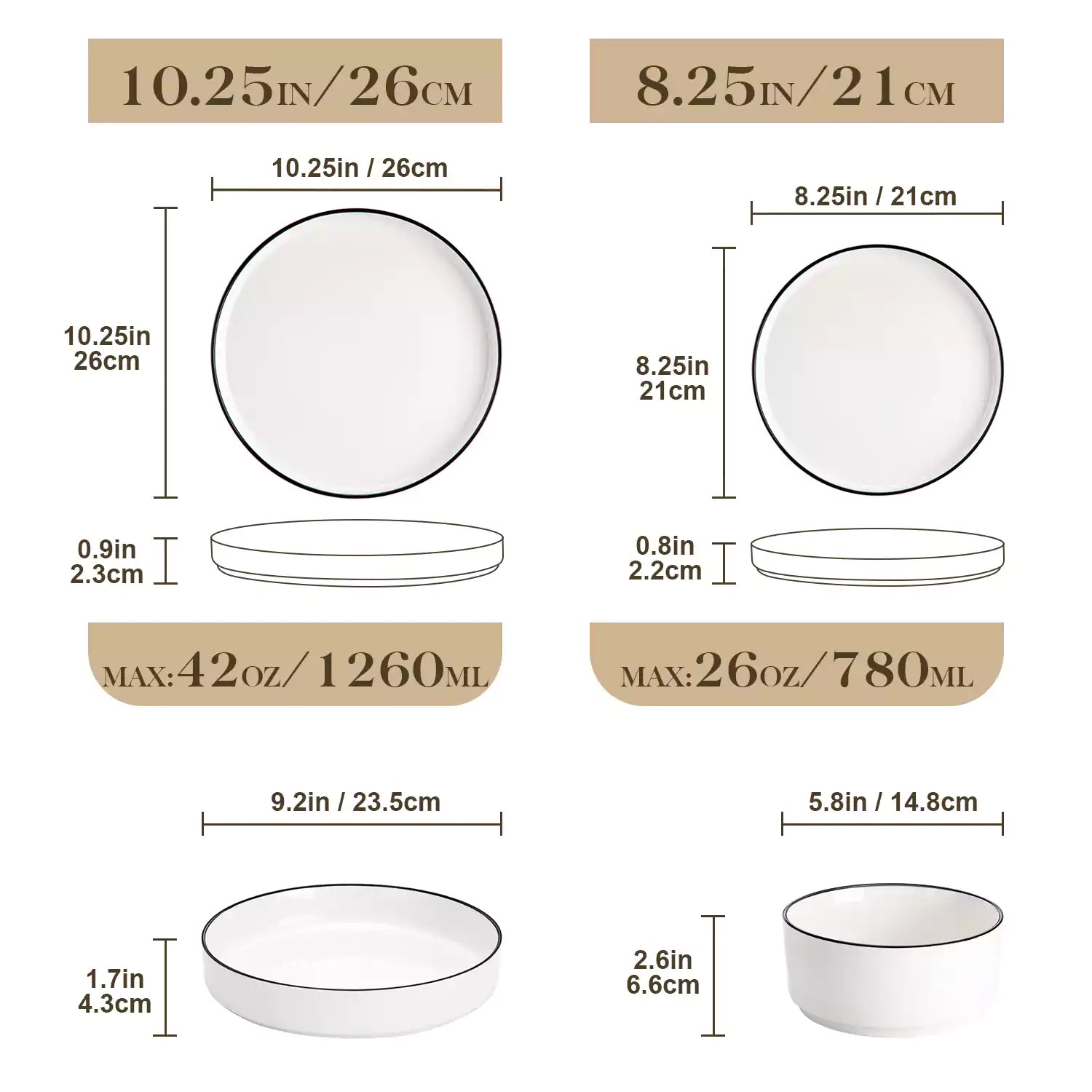 MALACASA Leah Porcelain Dinnerware Set,  includes Plates, Pasta Bowls, and Cereal Bowls. Perfect for elevating family meals or entertaining guests with a touch of sophistication.Black Trim