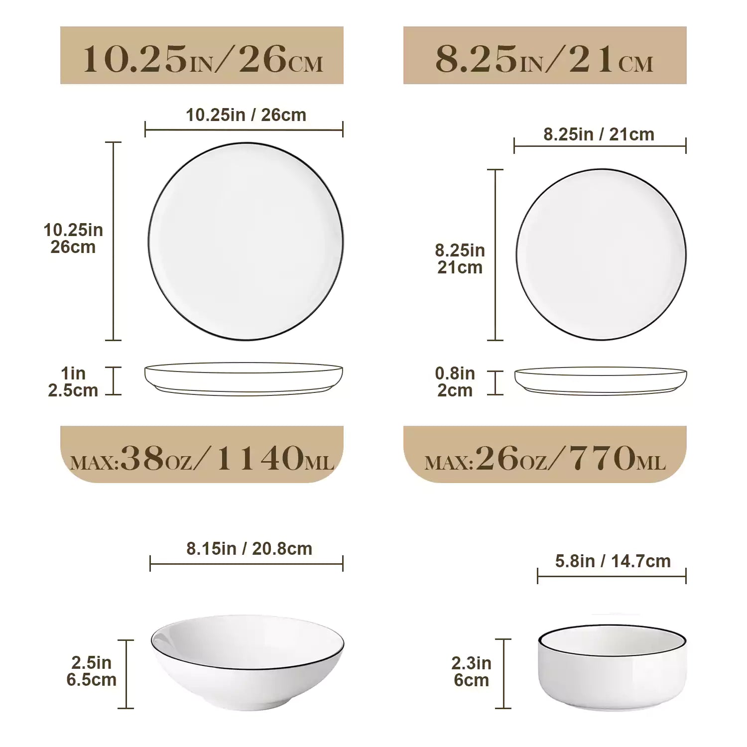 MALACASA Flat Round Luna 24 Piece Dinnerware Set with Soup Plates and Bowls - Black Trim