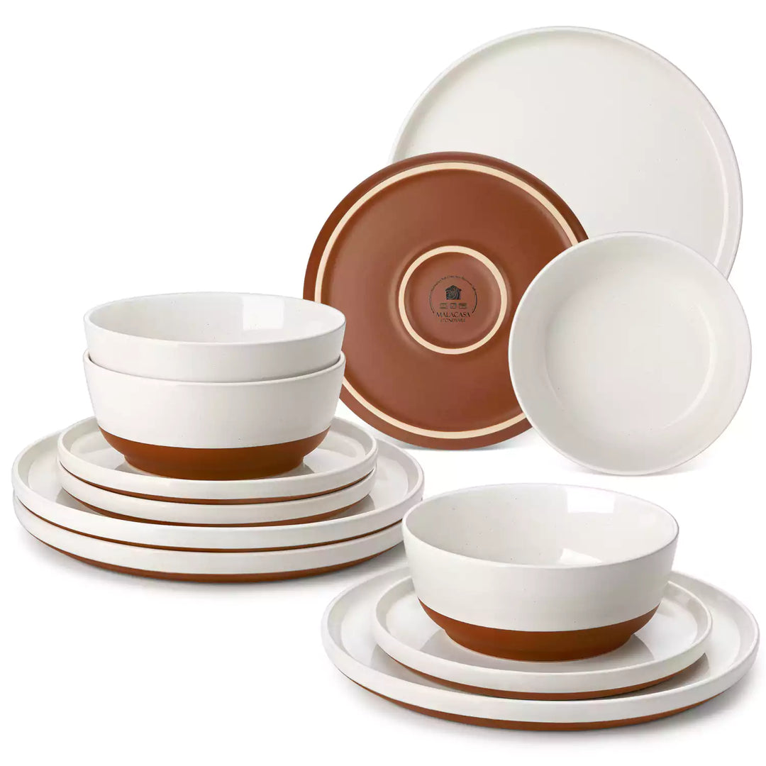 The ZORA 12-Piece Dinnerware Set brings effortless warmth and understated elegance to your table. Crafted from durable stoneware with a speckled sesame glaze and a matte clay-colored base, each piece features gently rounded edges and subtle handcrafted details. Designed for everyday meals or relaxed gatherings, this set for 4 includes 4 dinner plates, 4 dessert plates, and 4 bowls, all microwave, oven, and dishwasher safe. Mix and layer the pieces to create a coordinated, inviting table that lets your food shine.