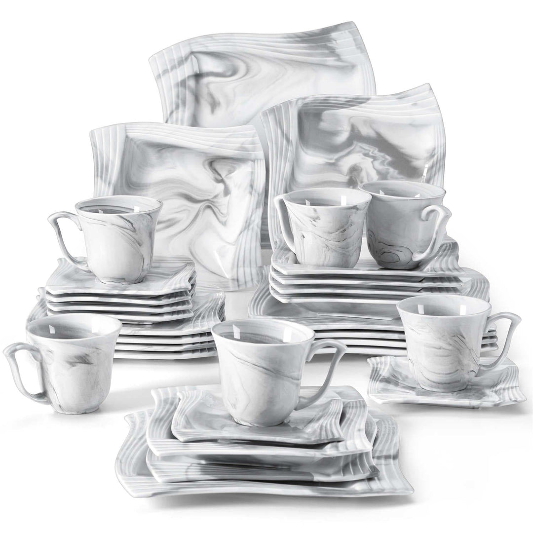 • Quadratisches Geschirrset aus feinem Porzellan mit Wellenstruktur, Service für 6 Personen, Marmorgrau/Elfenbeinweiß