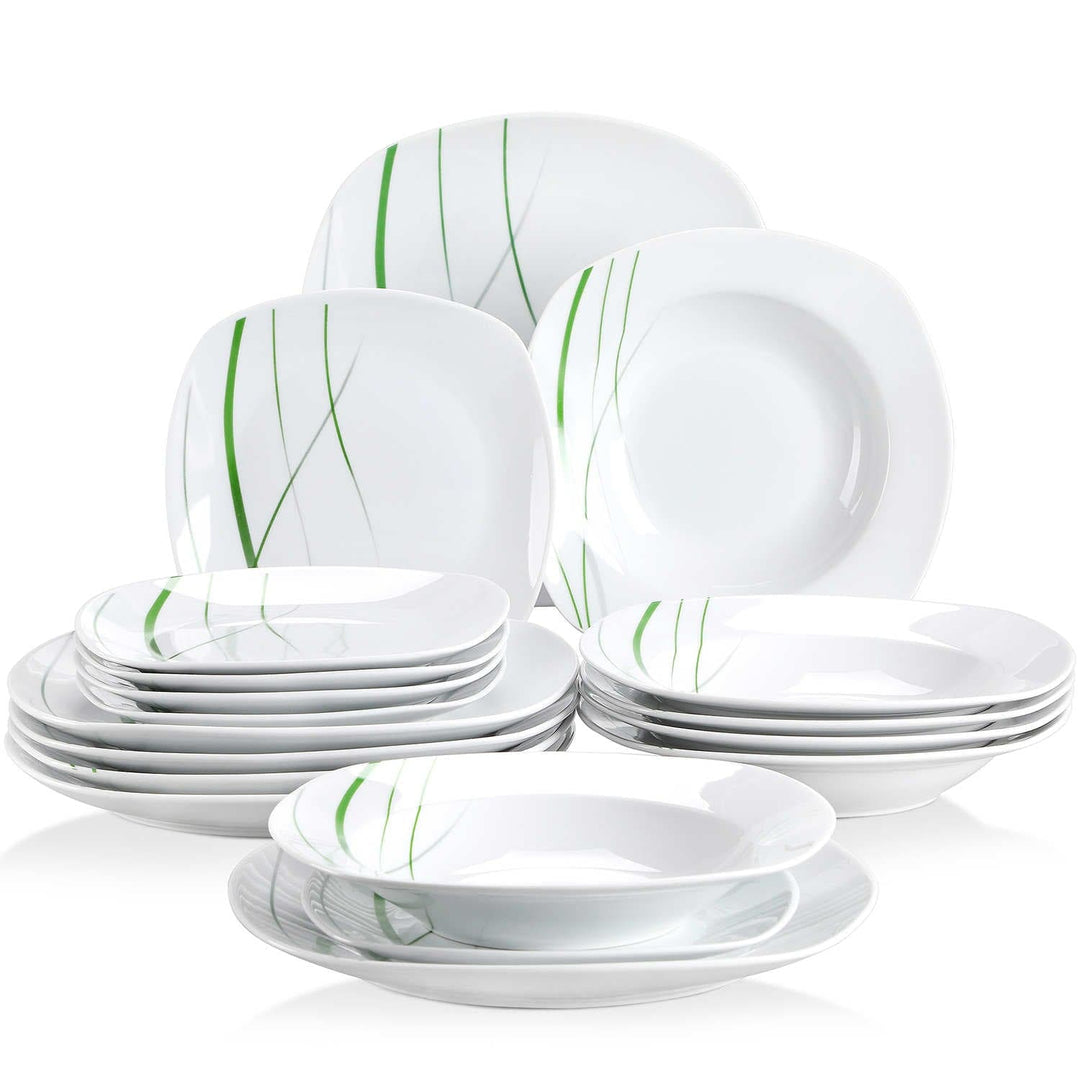 - Quadratisches Geschirrset aus feinem Porzellan, Service für 6 Personen, grünes Streifenmuster