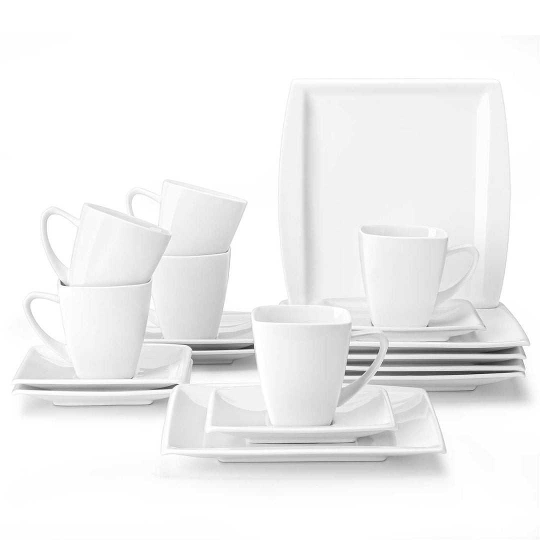 • Quadratisches Dessert-Kaffee-Set aus feinem Porzellan, Service für 6, Elfenbein weiß/ Marmor grau