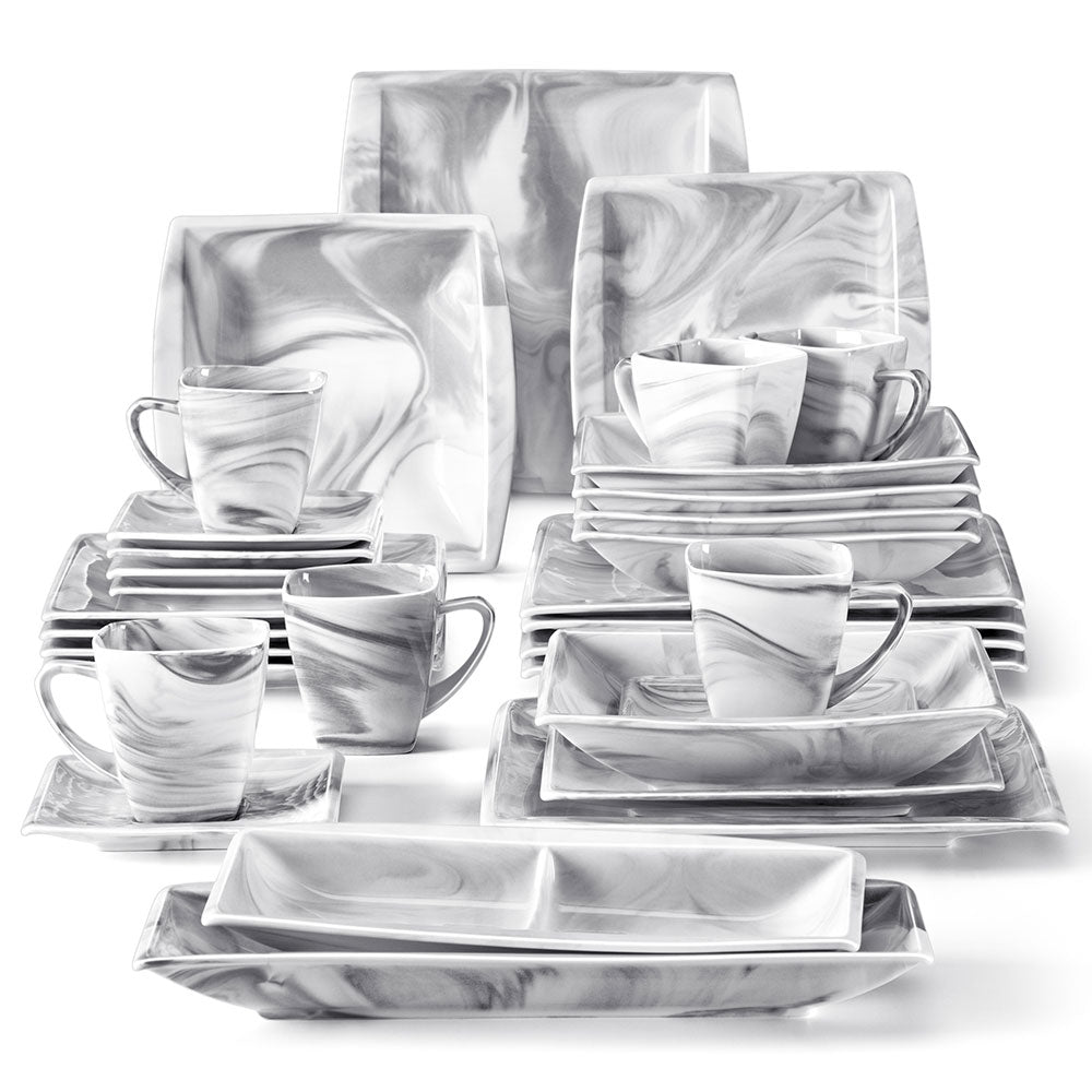 - Quadratisches Geschirrset aus feinem Porzellan, Service für 6 Personen, Marmorgrau