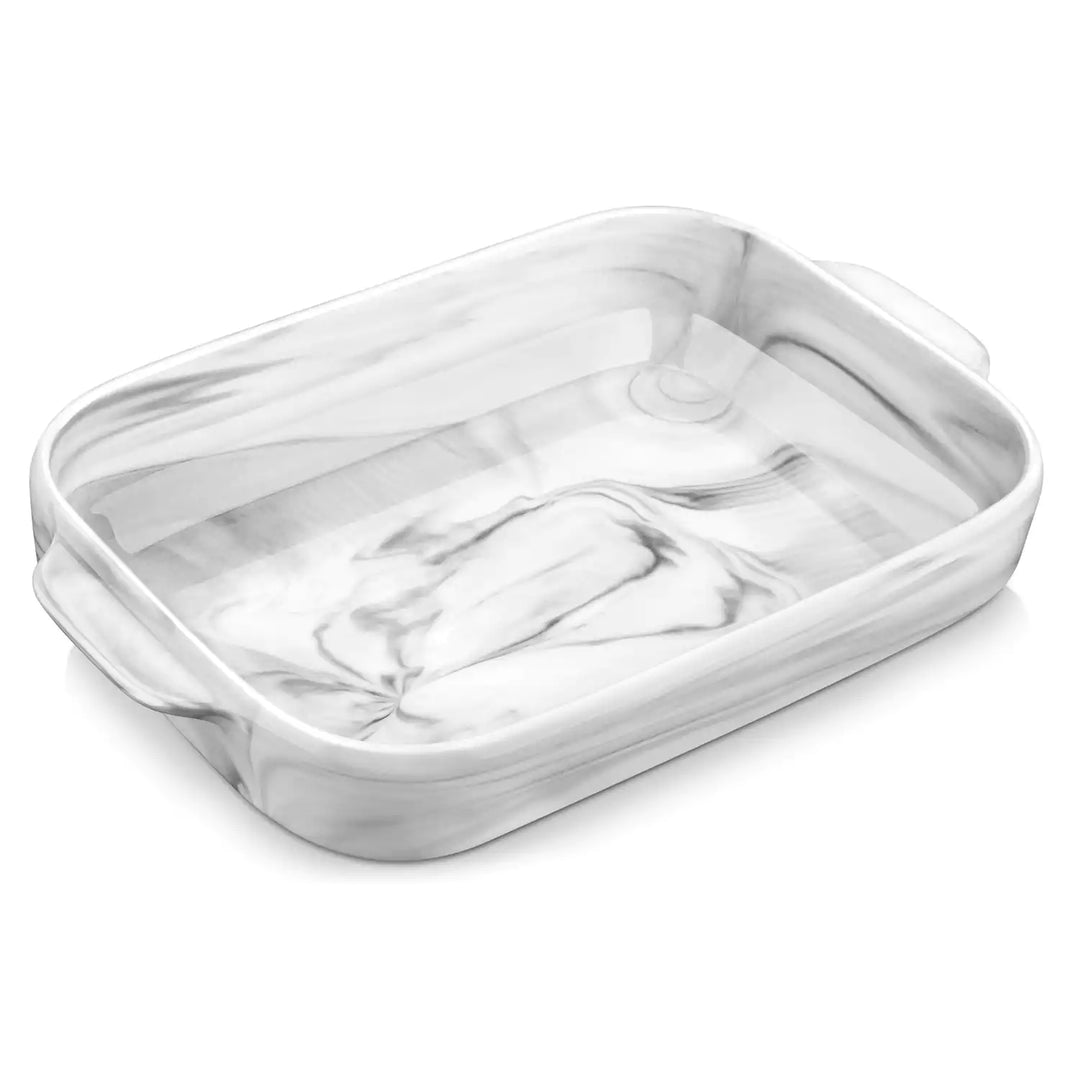 Handled porcelain baking dish with roasted lamb ribs and fresh vegetables