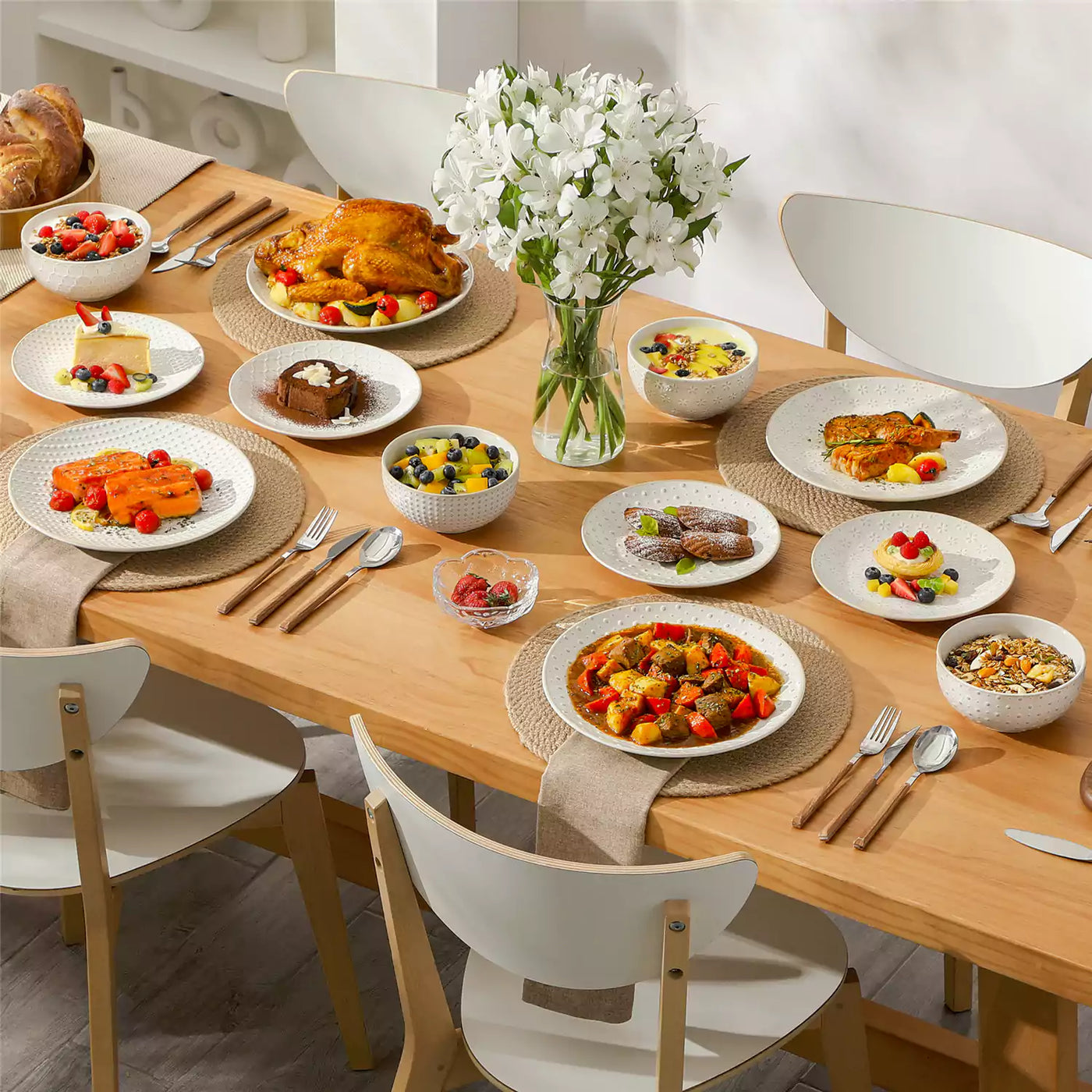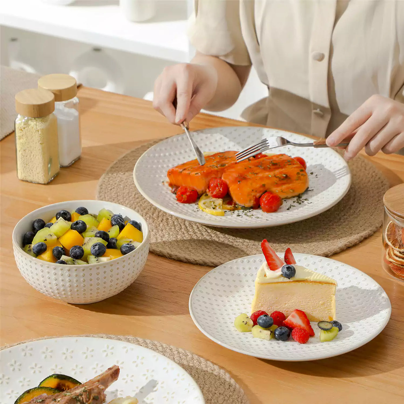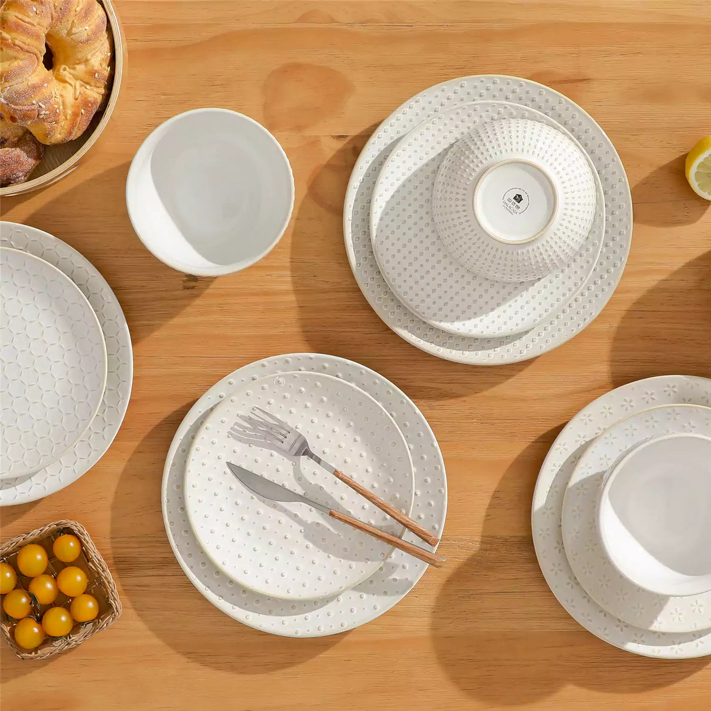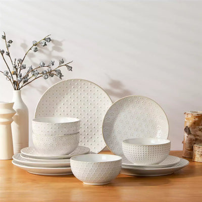 The Lydia 12-Piece Dinnerware Set brings artisanal texture and timeless charm to your table with four unique embossed motifs—dotted borders, diamond patterns, daisy florals, and hexagonal reliefs. Crafted from durable stoneware and finished in soft antique white with a hand-applied reactive glaze, each piece displays subtle color variations that highlight its handcrafted character. The set includes dinner plates, salad plates, and cereal bowls for four. Microwave, oven, and dishwasher safe.