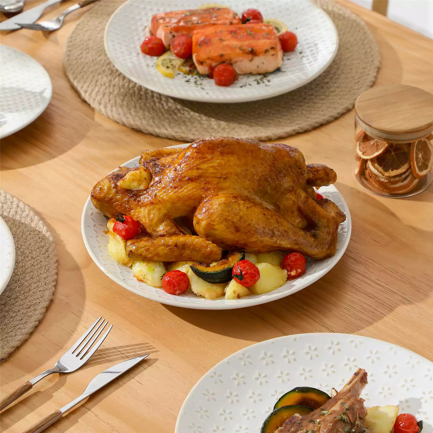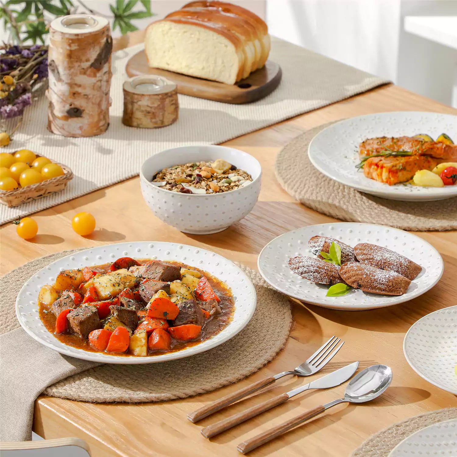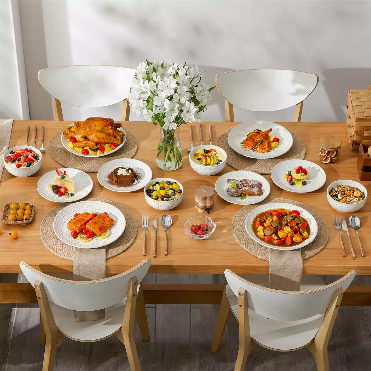 The Lydia 12-Piece Dinnerware Set brings artisanal texture and timeless charm to your table with four unique embossed motifs—dotted borders, diamond patterns, daisy florals, and hexagonal reliefs. Crafted from durable stoneware and finished in soft antique white with a hand-applied reactive glaze, each piece displays subtle color variations that highlight its handcrafted character. The set includes dinner plates, salad plates, and cereal bowls for four. Microwave, oven, and dishwasher safe.