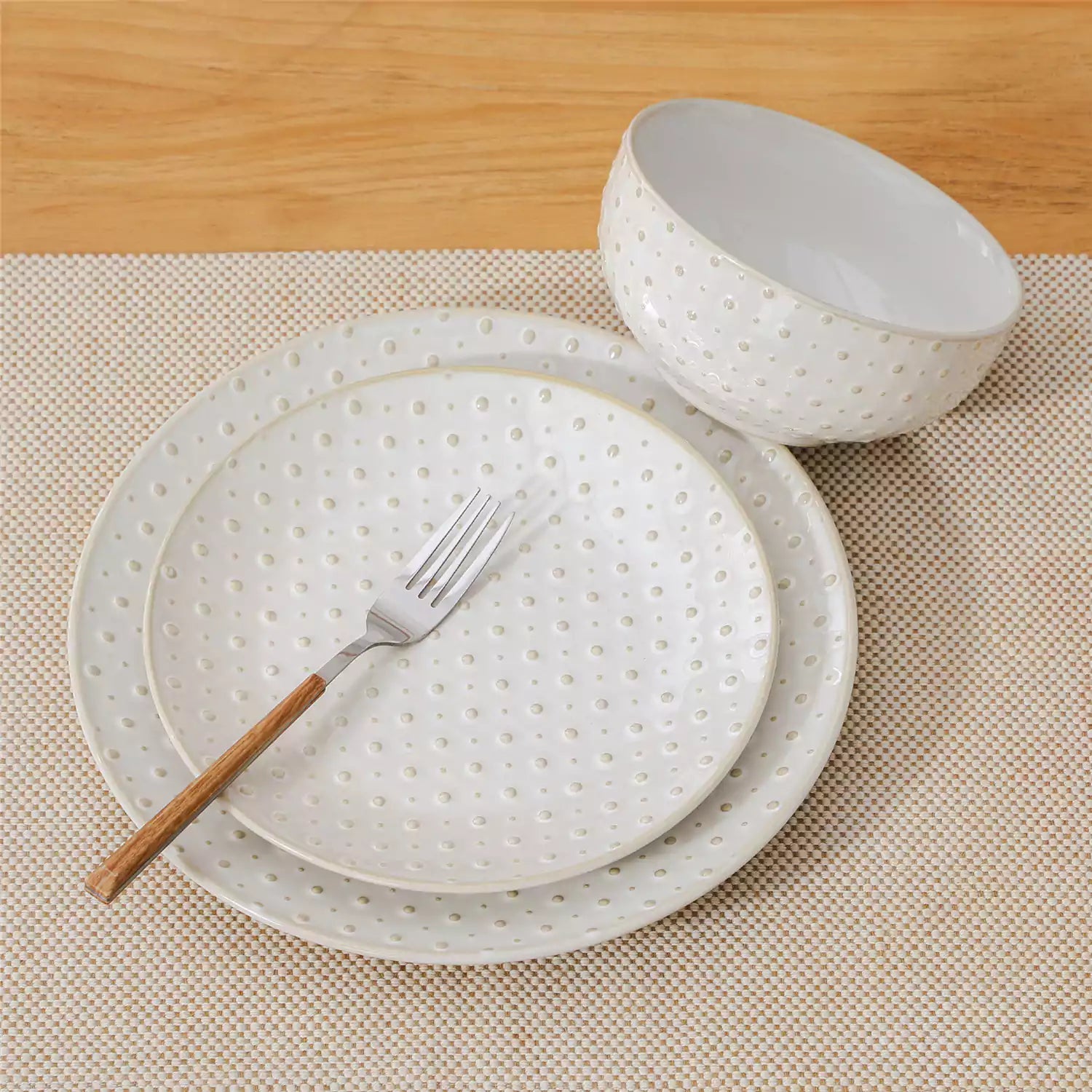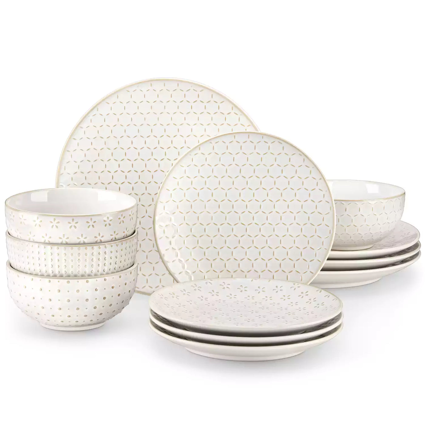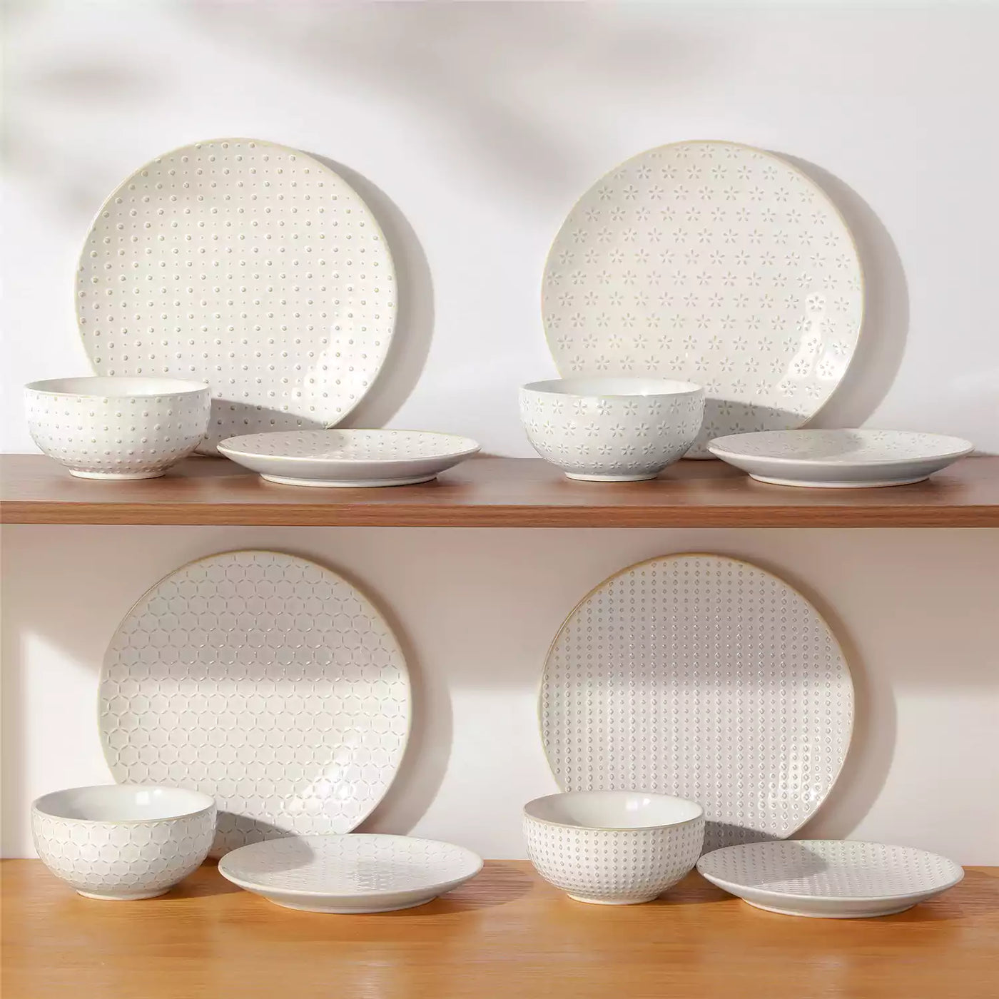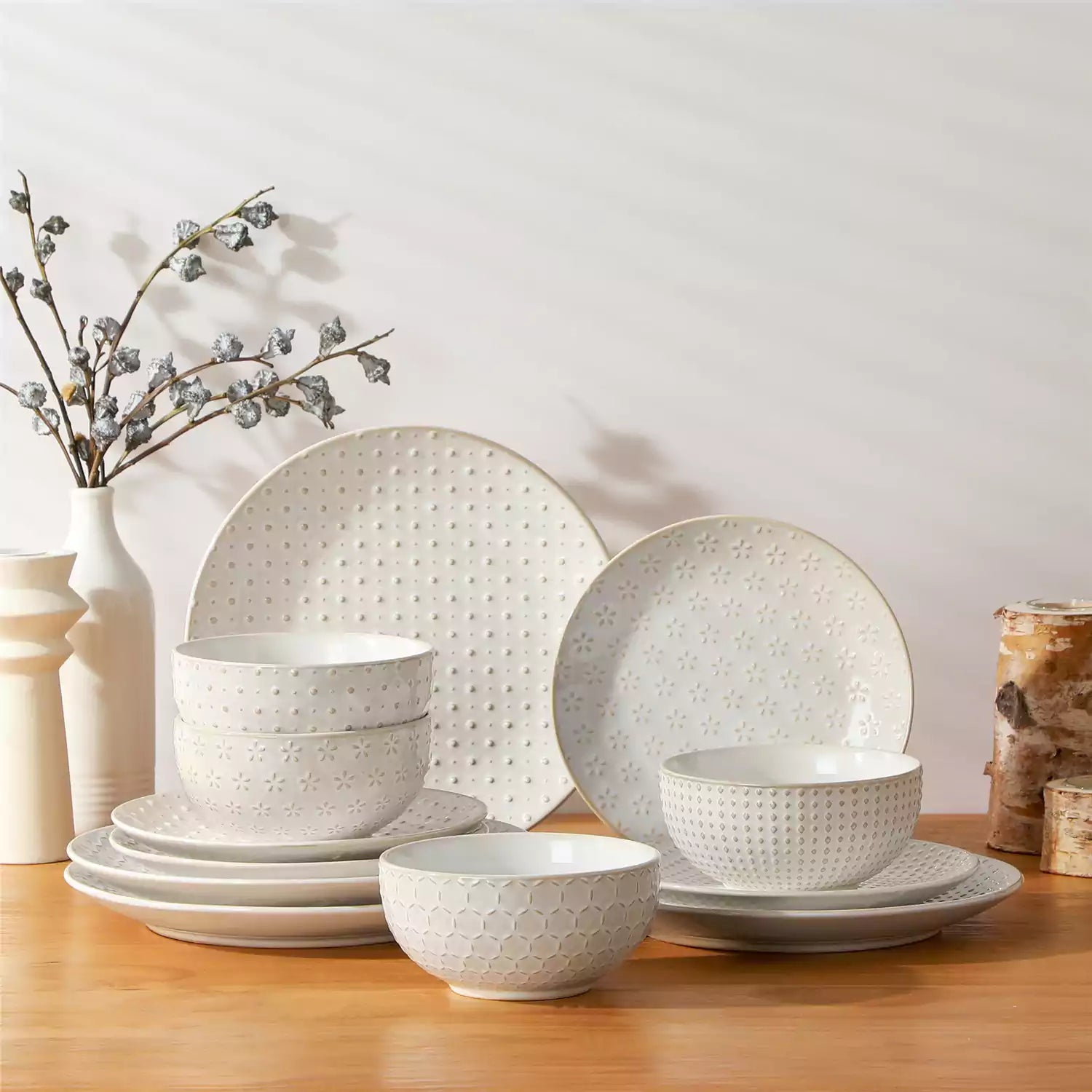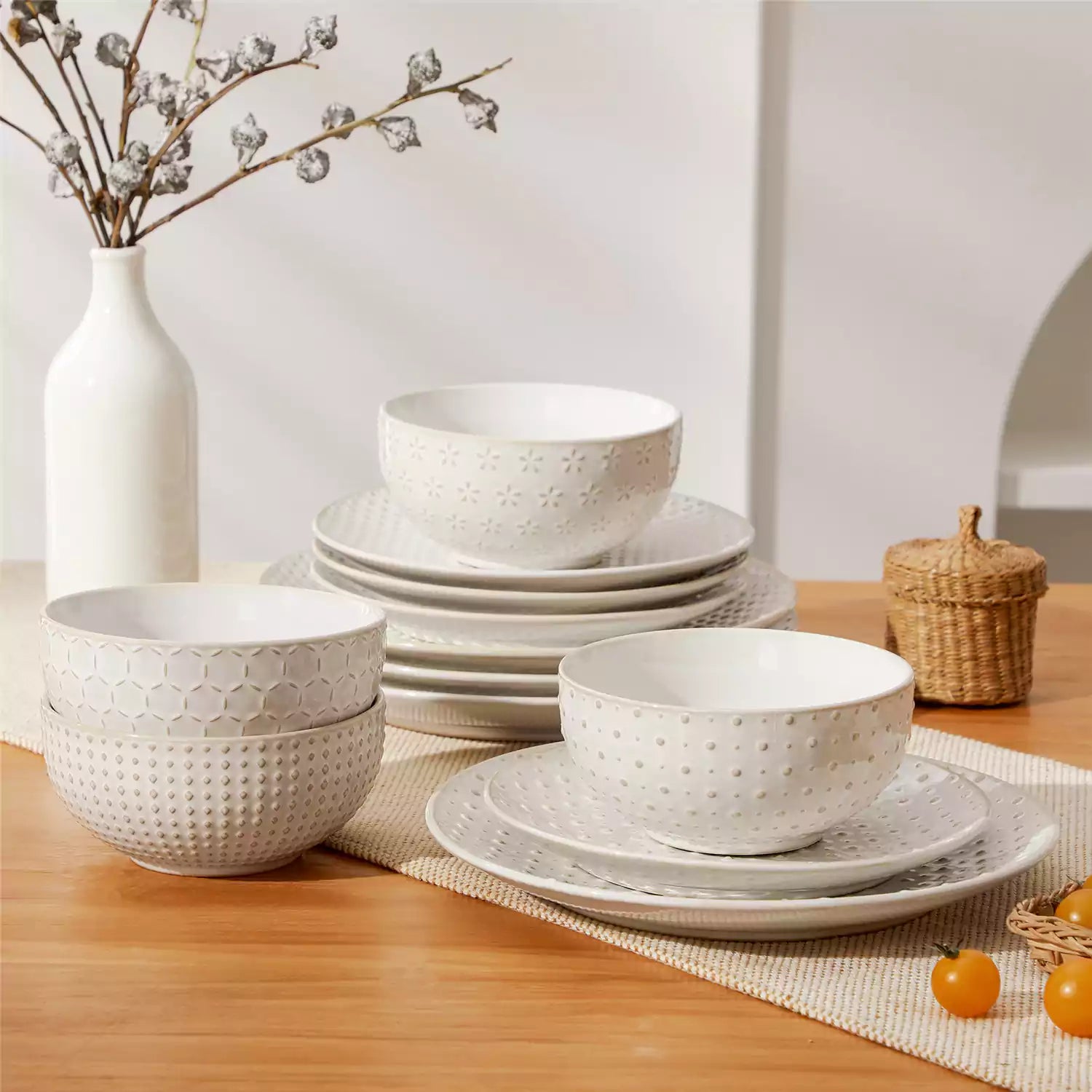 Lydia 12-Piece Stoneware Dinnerware Set With Unique Embossed Motifs Ideal For Everyday Or Casual Dining.