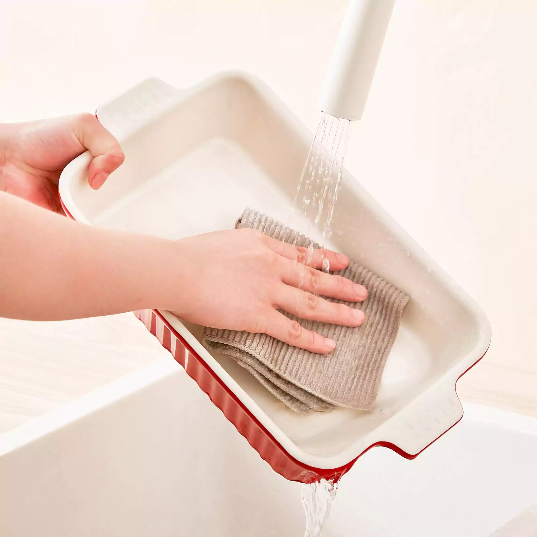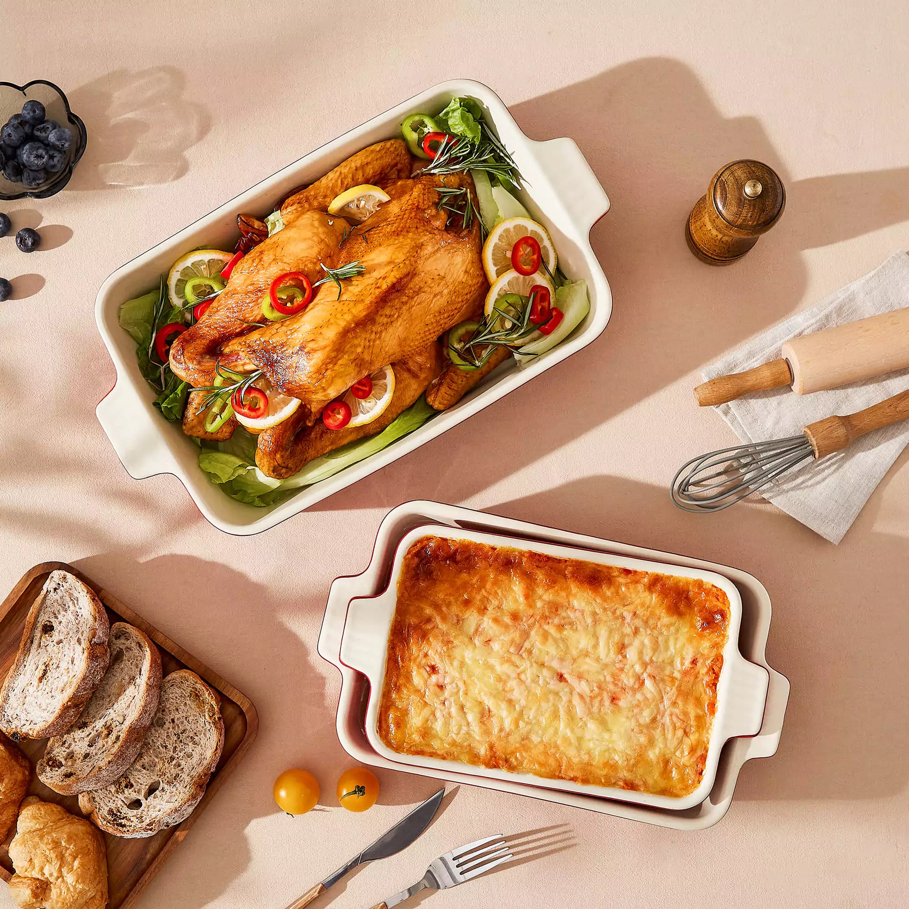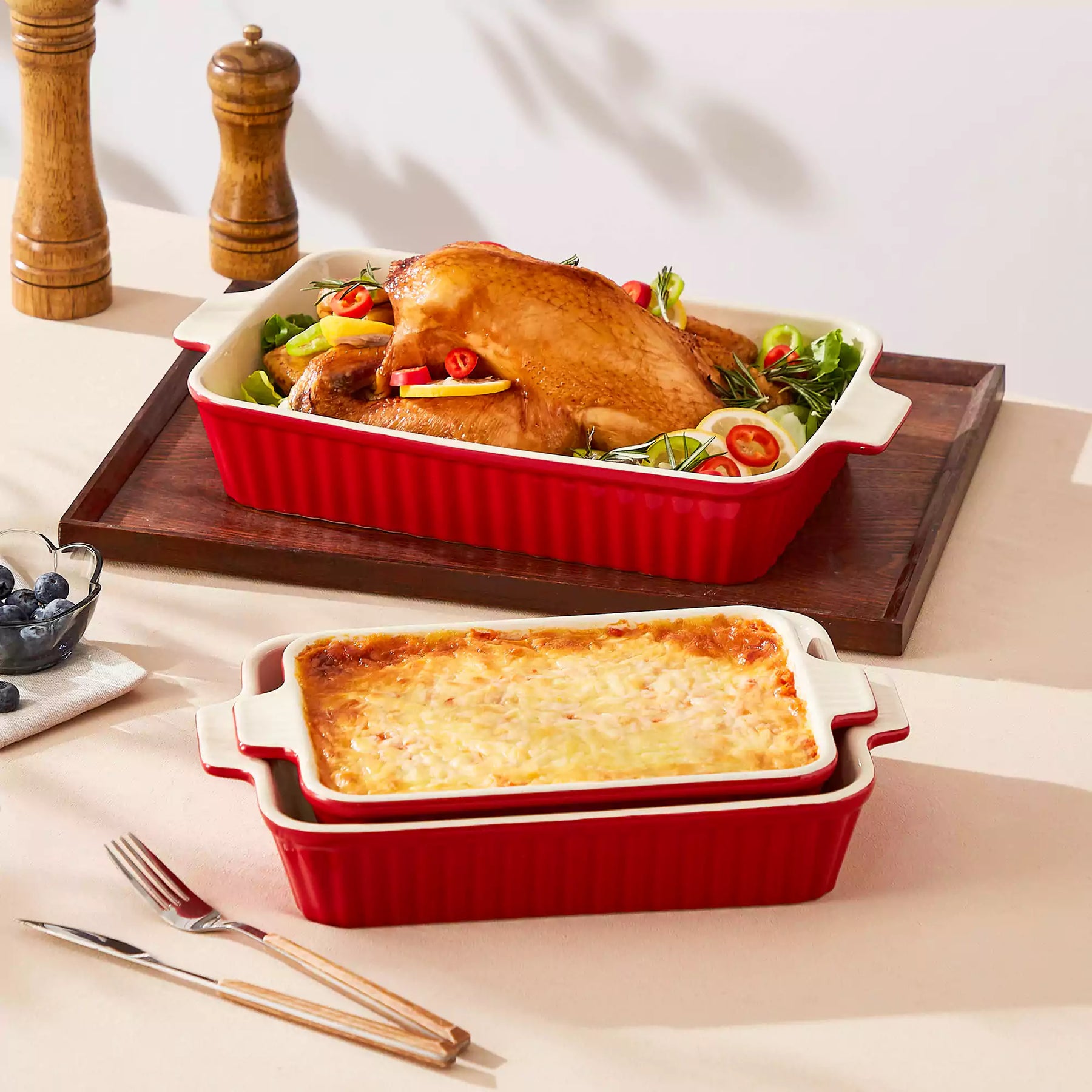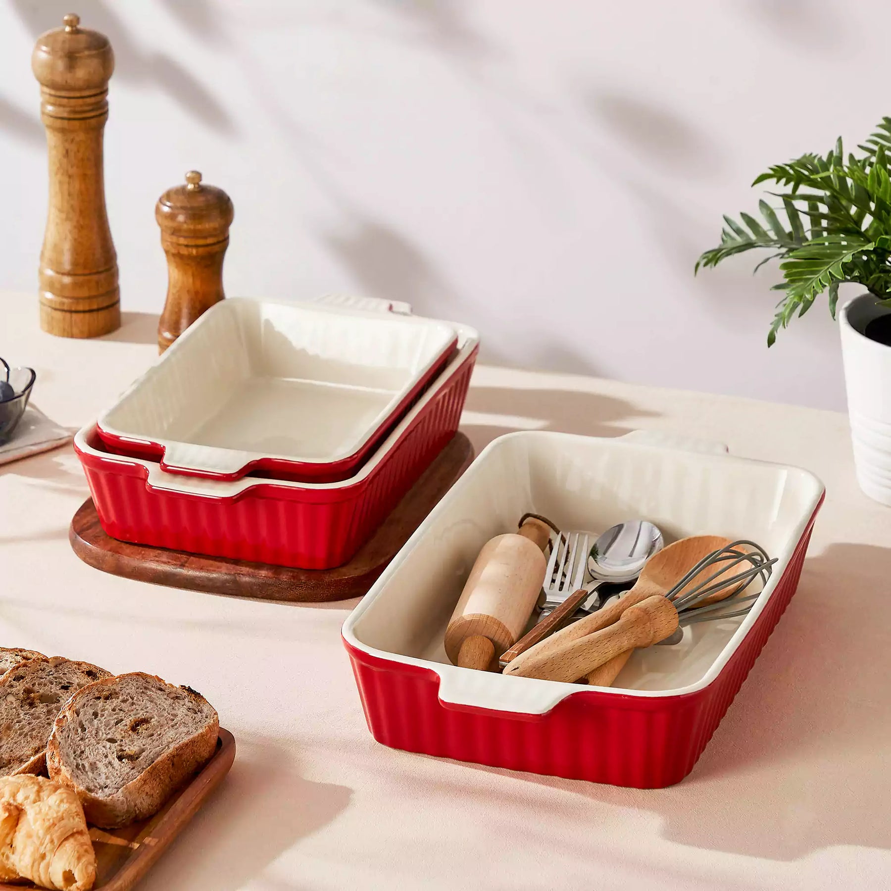 Bold and vibrant, this porcelain baking dish set brings life to the table. The glossy red exterior and creamy white interior create a striking contrast that frames everything from casseroles to festive sides. With three versatile sizes—14.7″, 12.2″, and 11.1″—the set meets a wide range of baking needs. Vertical fluted exterior adds texture, and sturdy tab handles provide safe, comfortable oven-to-table transport. Durable porcelain stacks neatly and is oven, microwave, and dishwasher safe, making it perfect for everyday meals and celebratory gatherings.