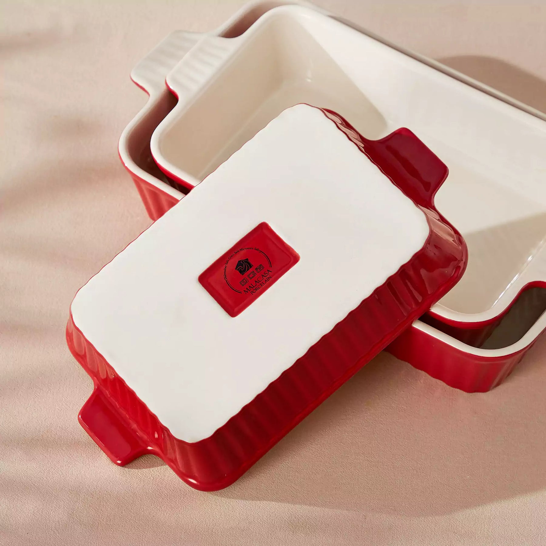 Red ceramic baking dishes with measurements and Malacasa logo on a white background