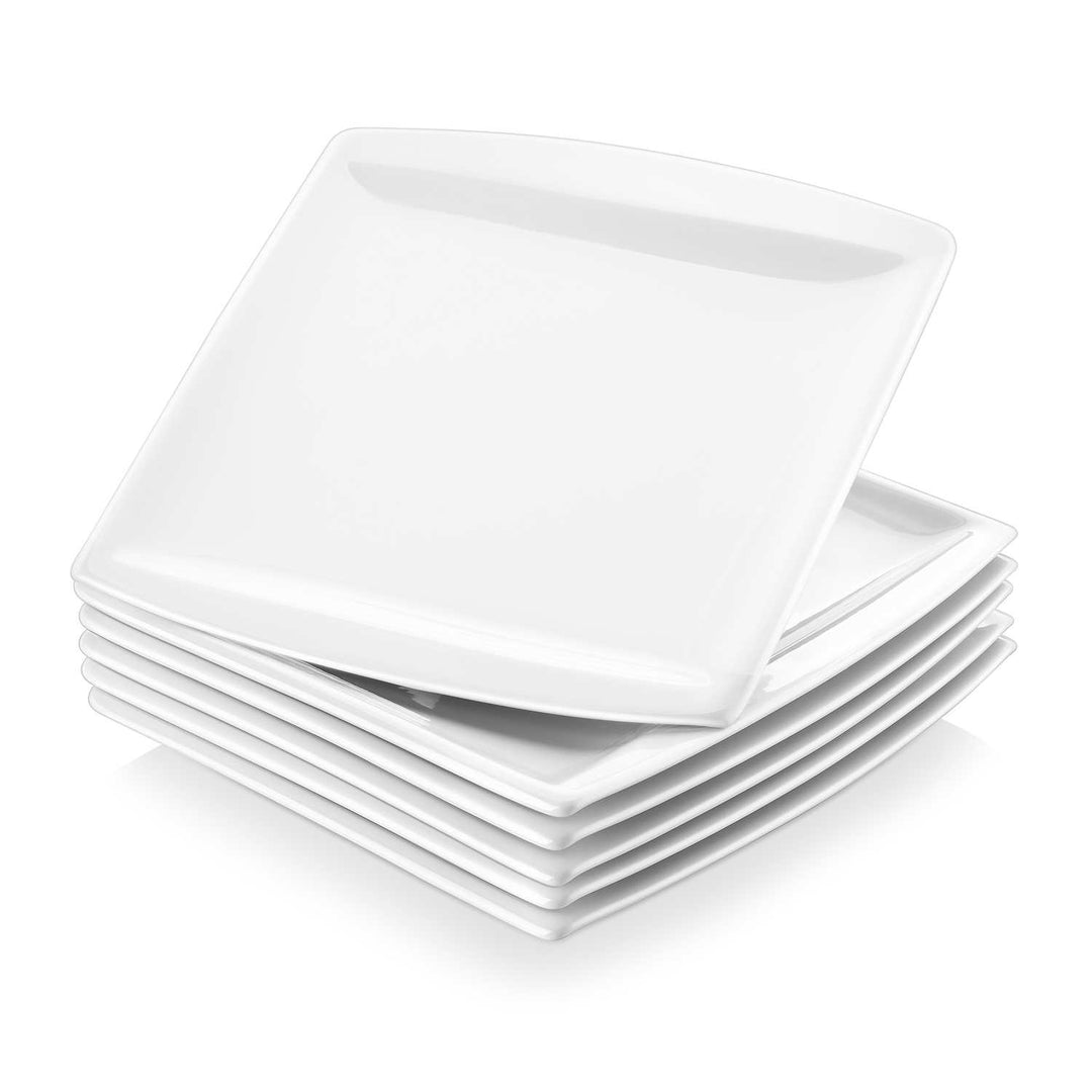 • Platos cuadrados de porcelana fina, juego de 6, blanco marfil/gris mármol