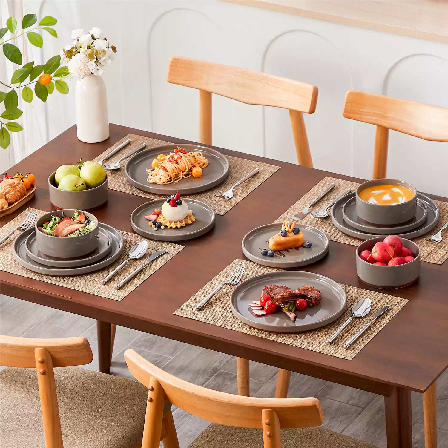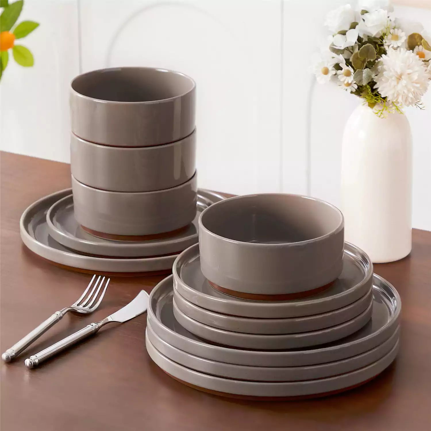 Set of grey stoneware bowls and plates on a wooden table with a vase of flowers in the background.