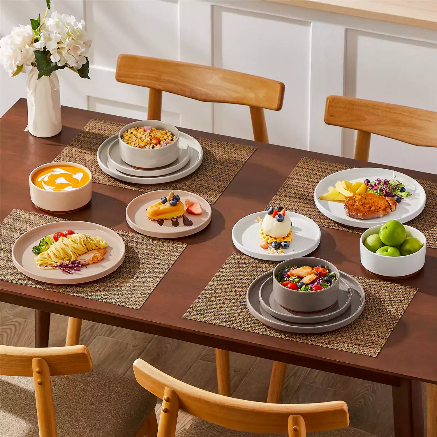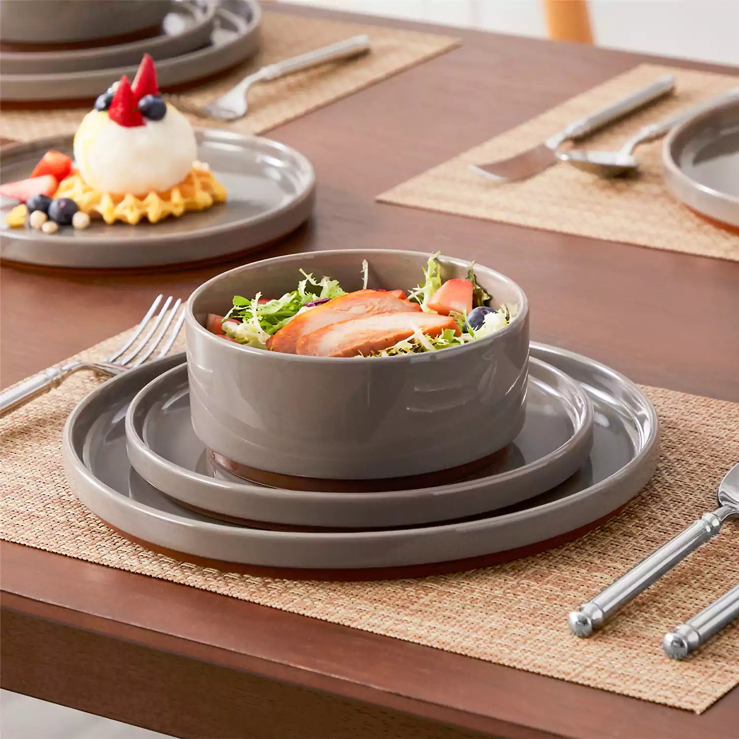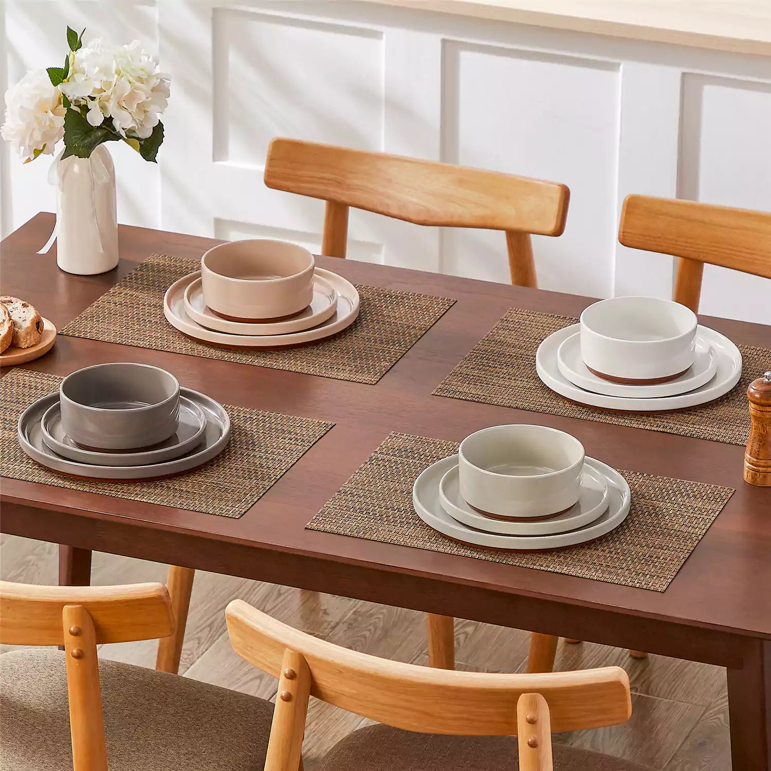 Dining table set with stoneware bowls, plates, and placemats on a wooden table.