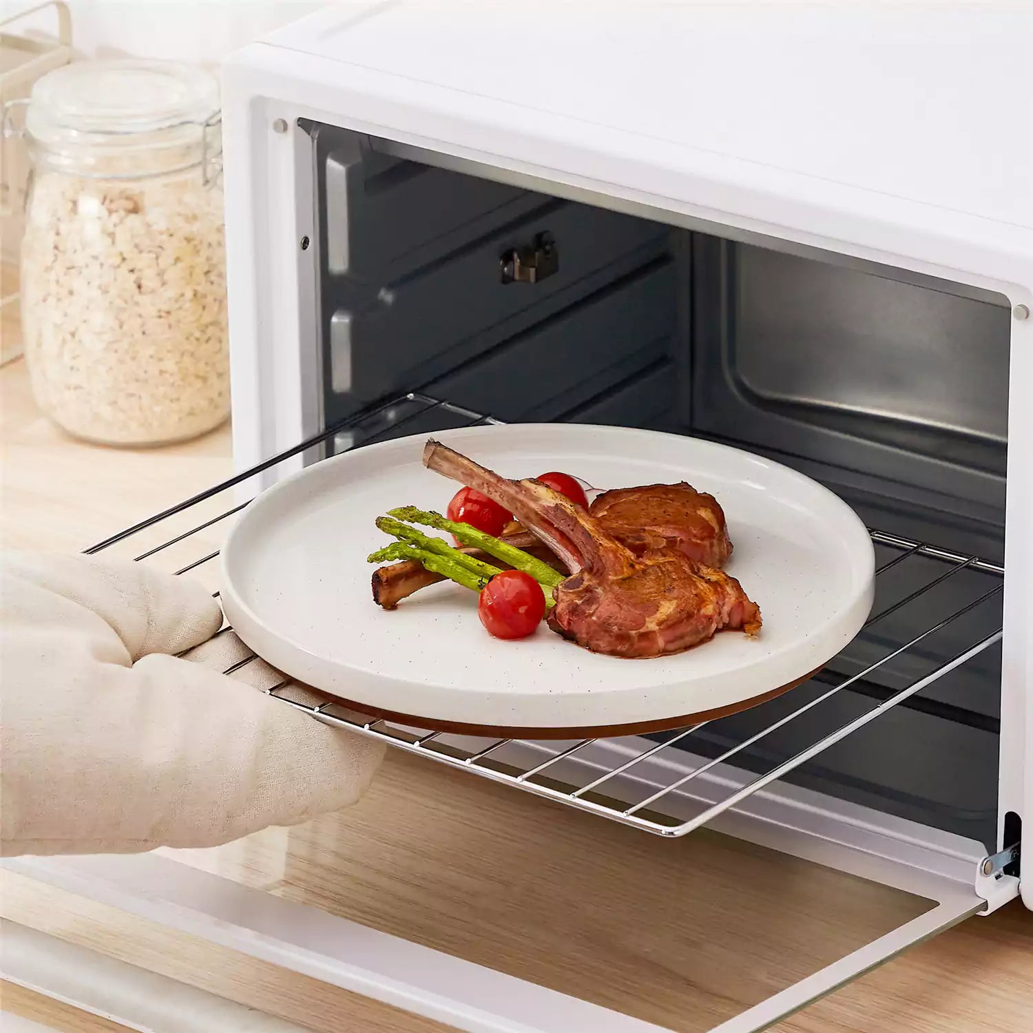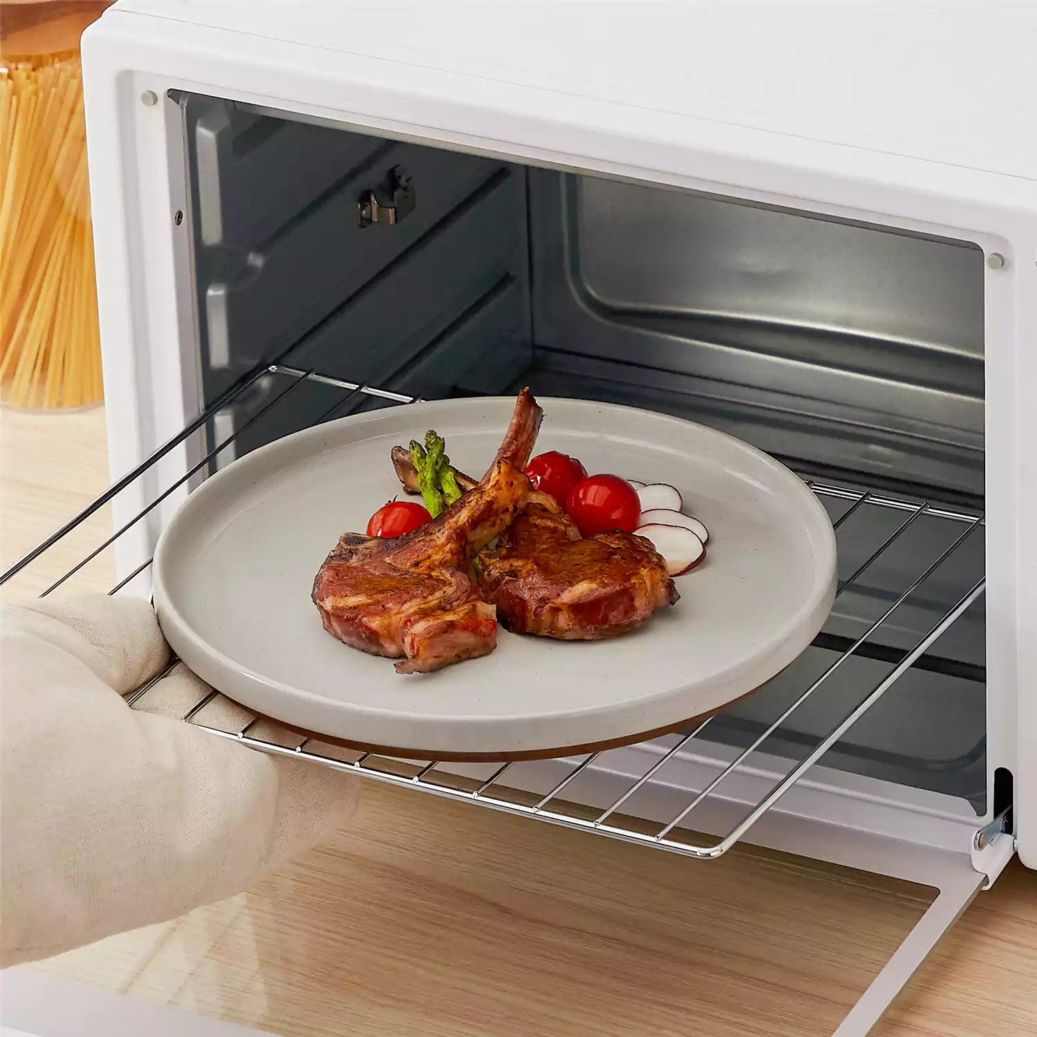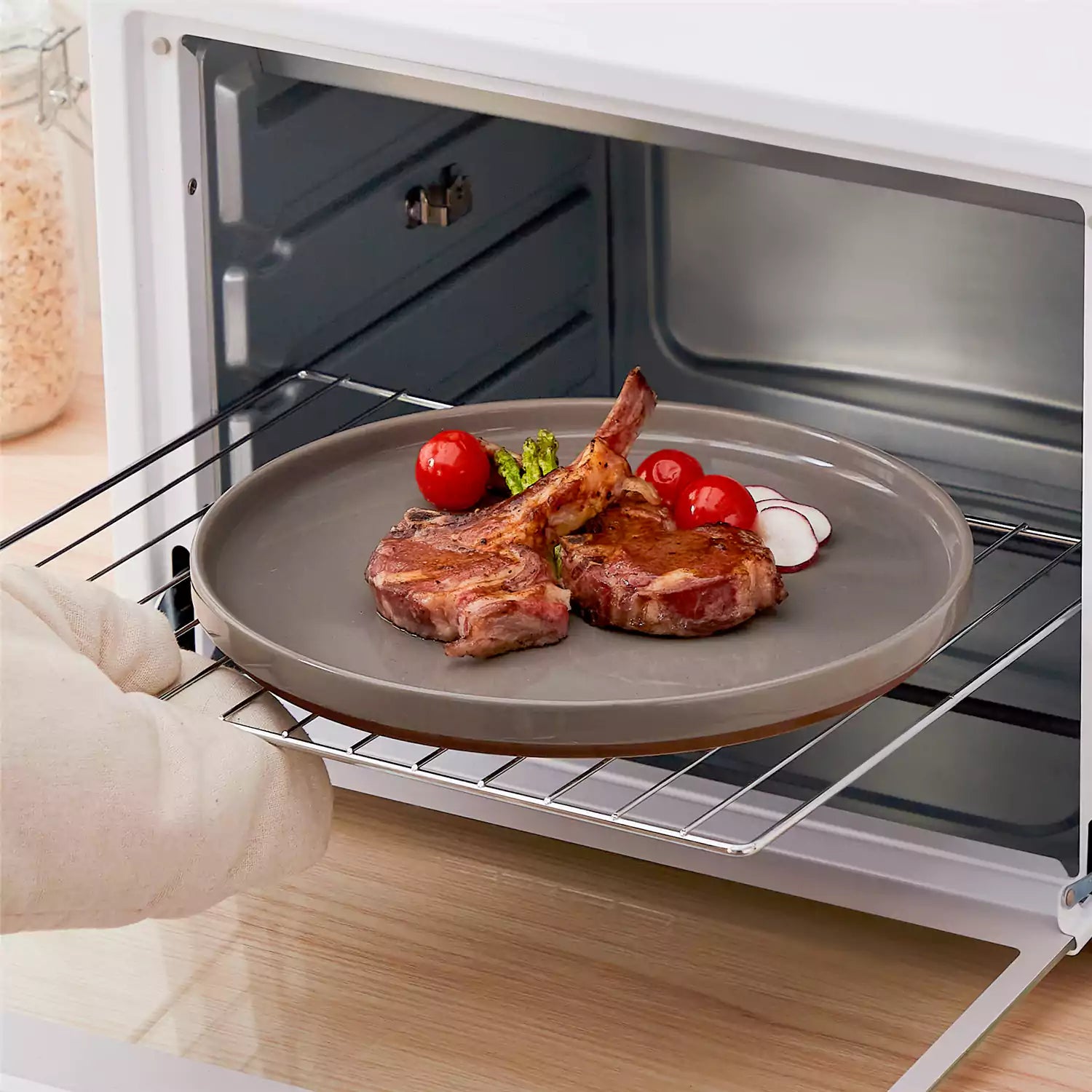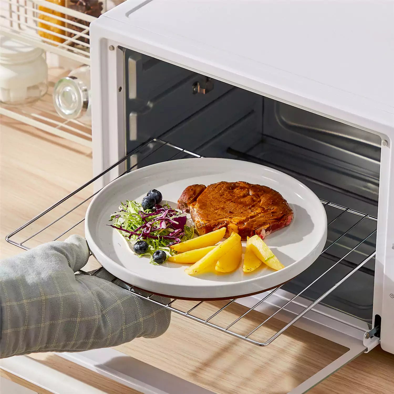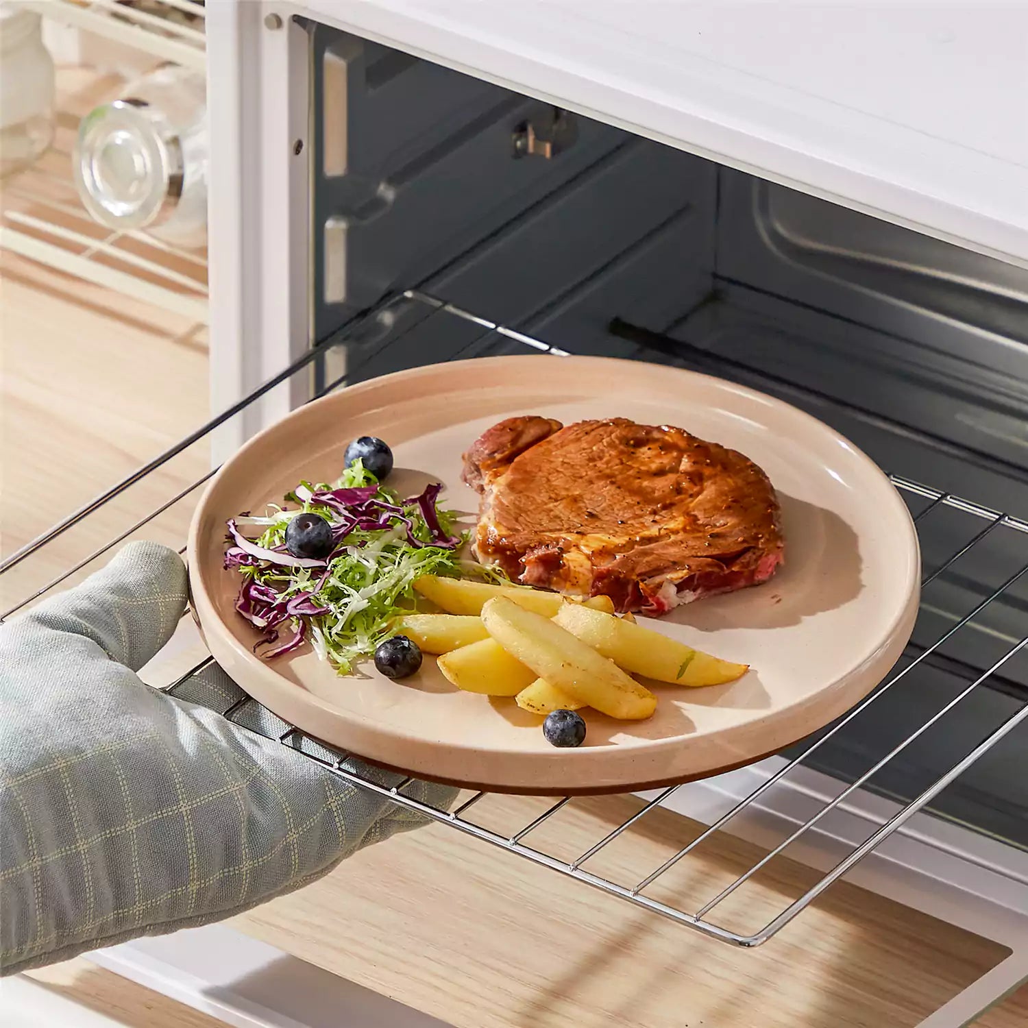 Person taking a plate with food out of an oven