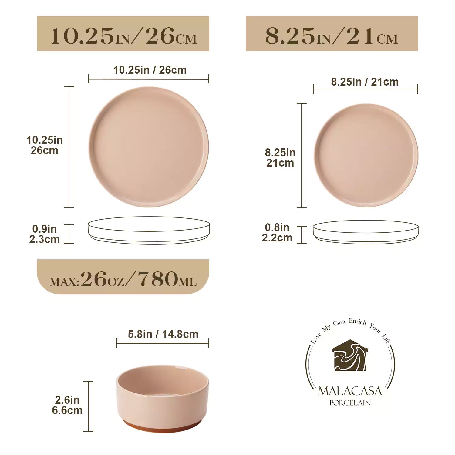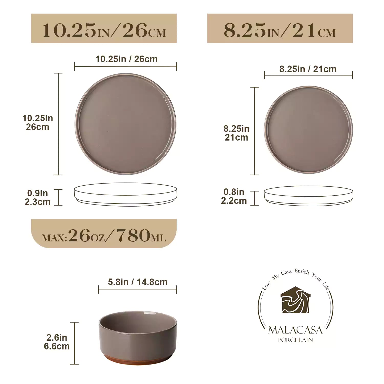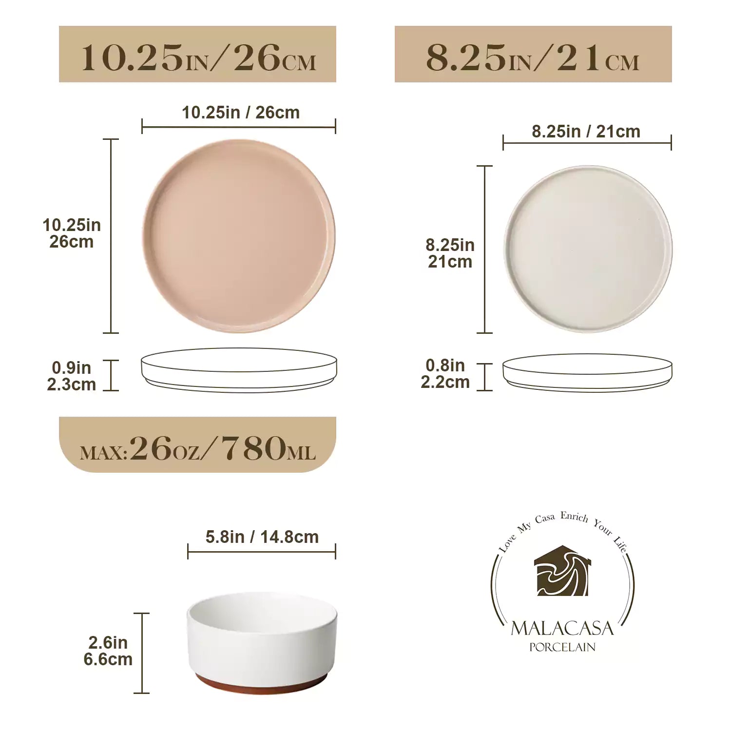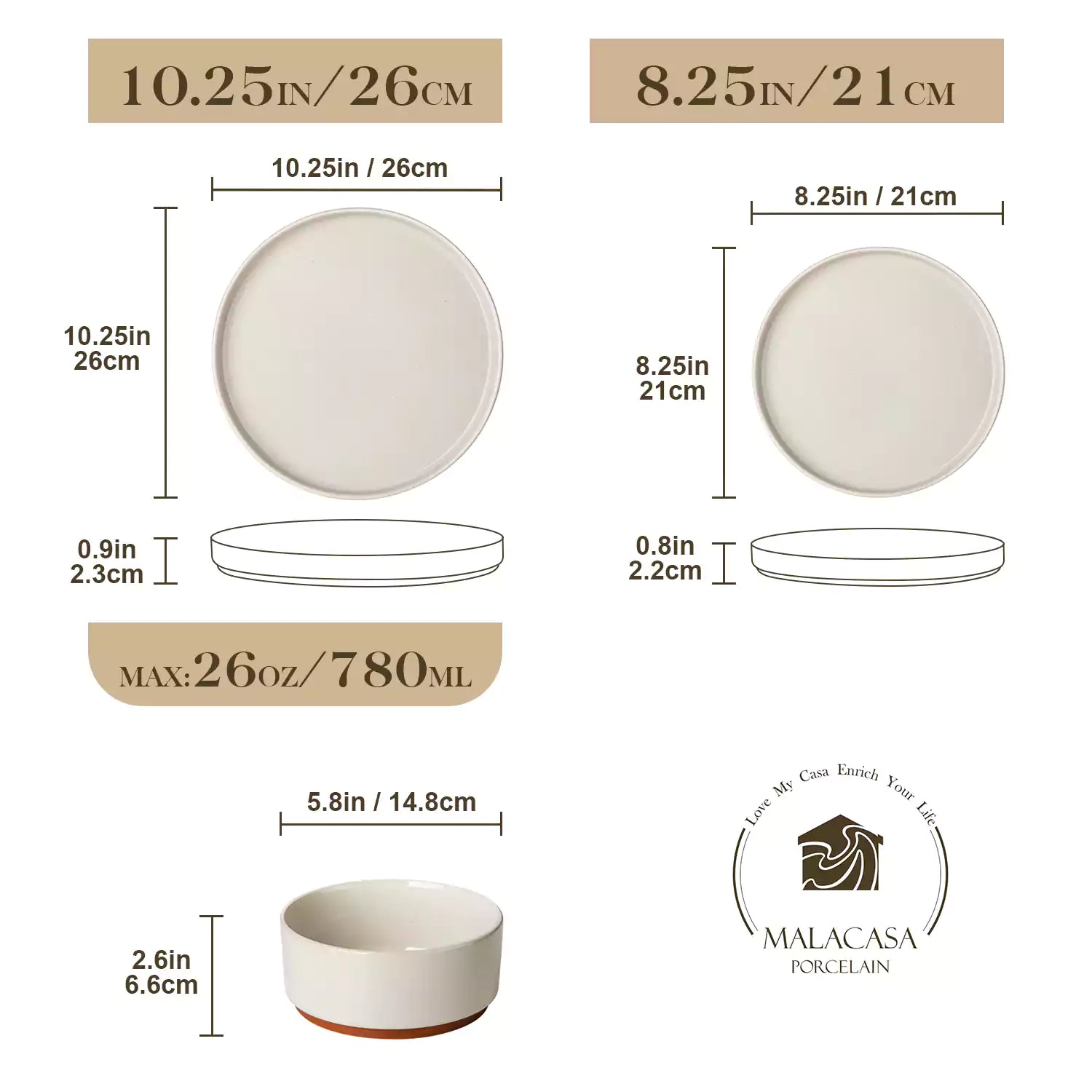 Three stoneware plates with measurements and dimensions on a beige background, featuring the Malacasa logo.