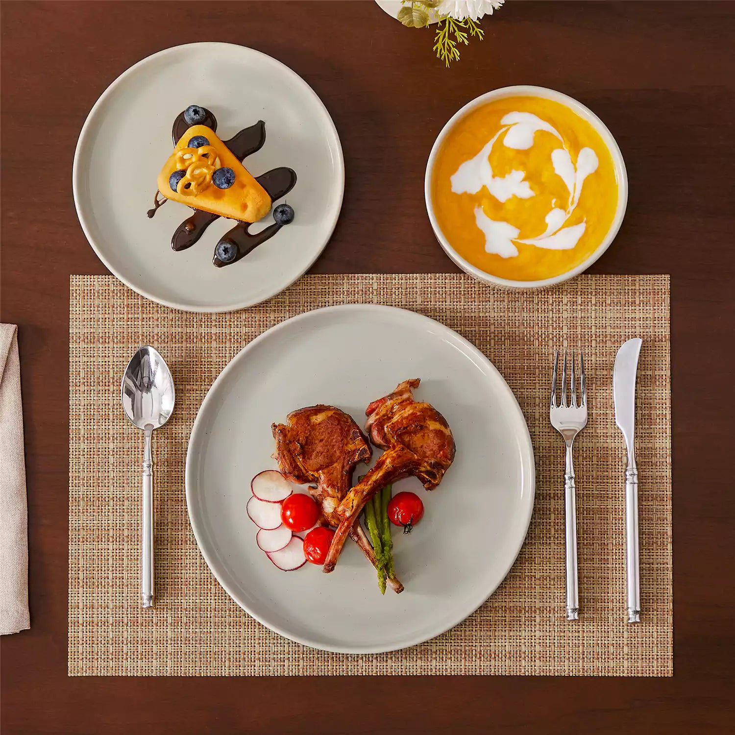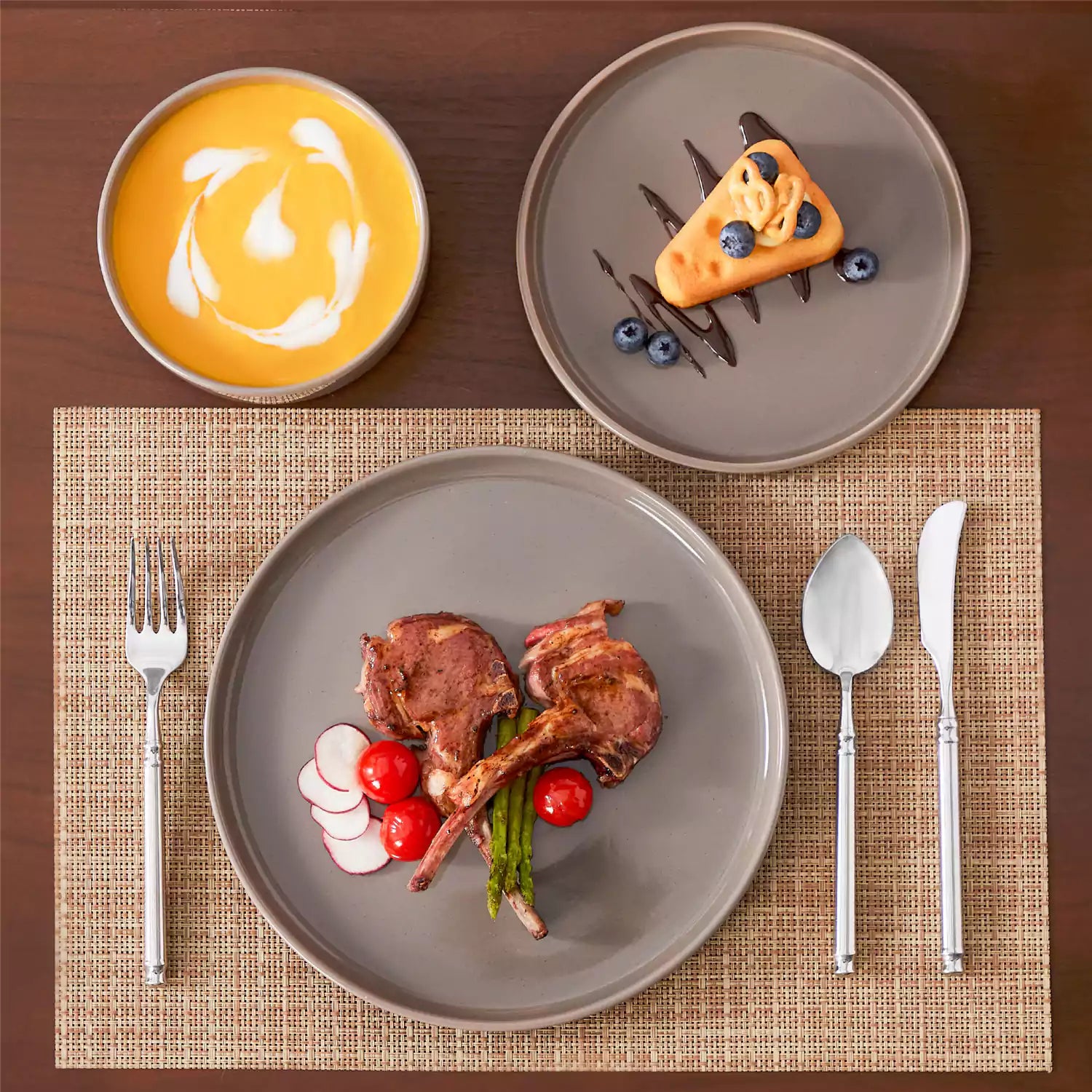 Dinner setting with a bowl of soup, dessert, and cutlery on a table.