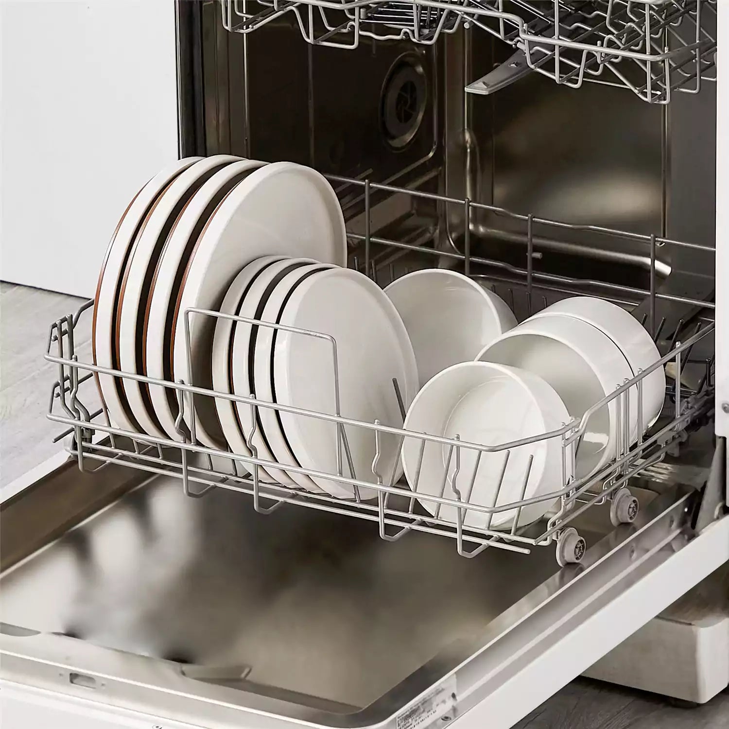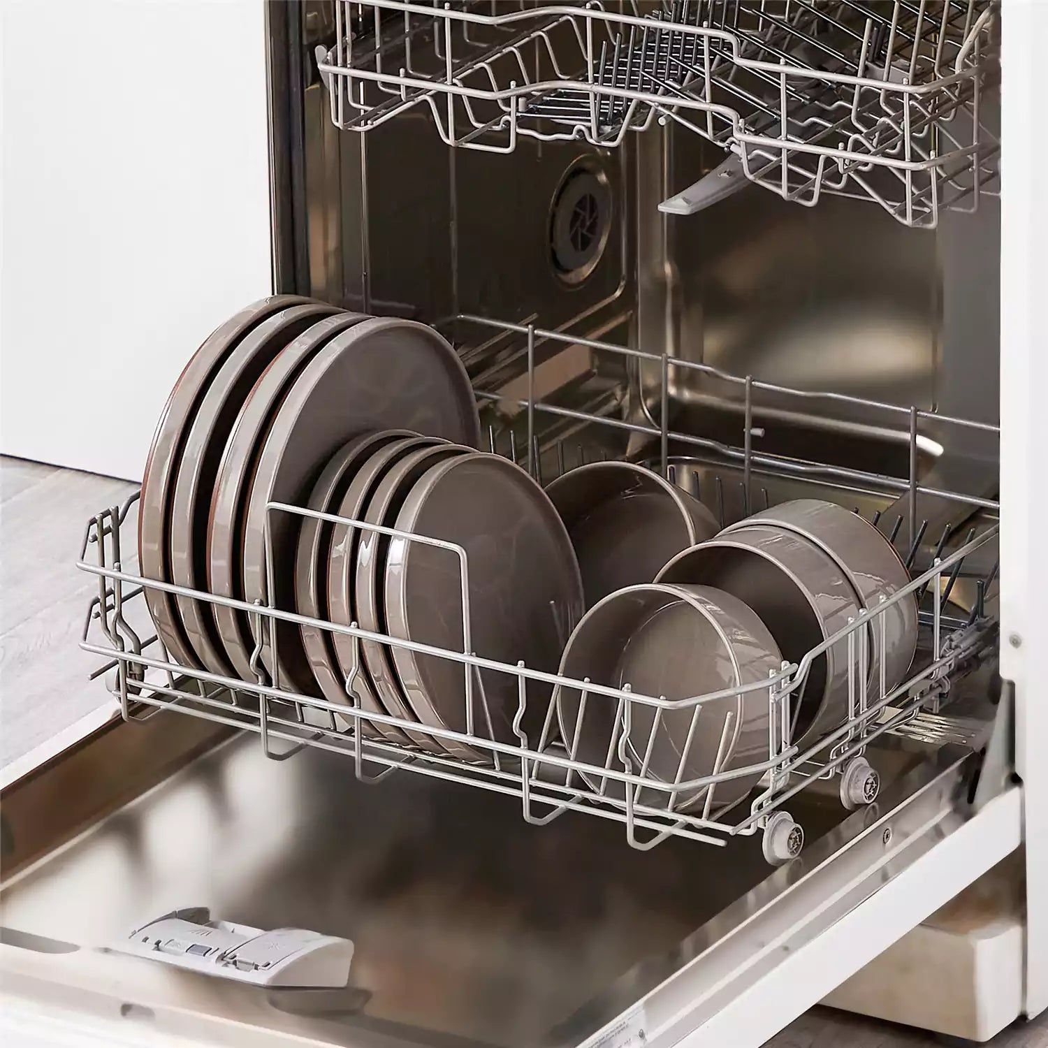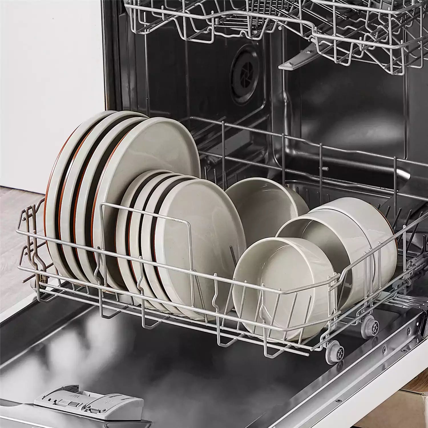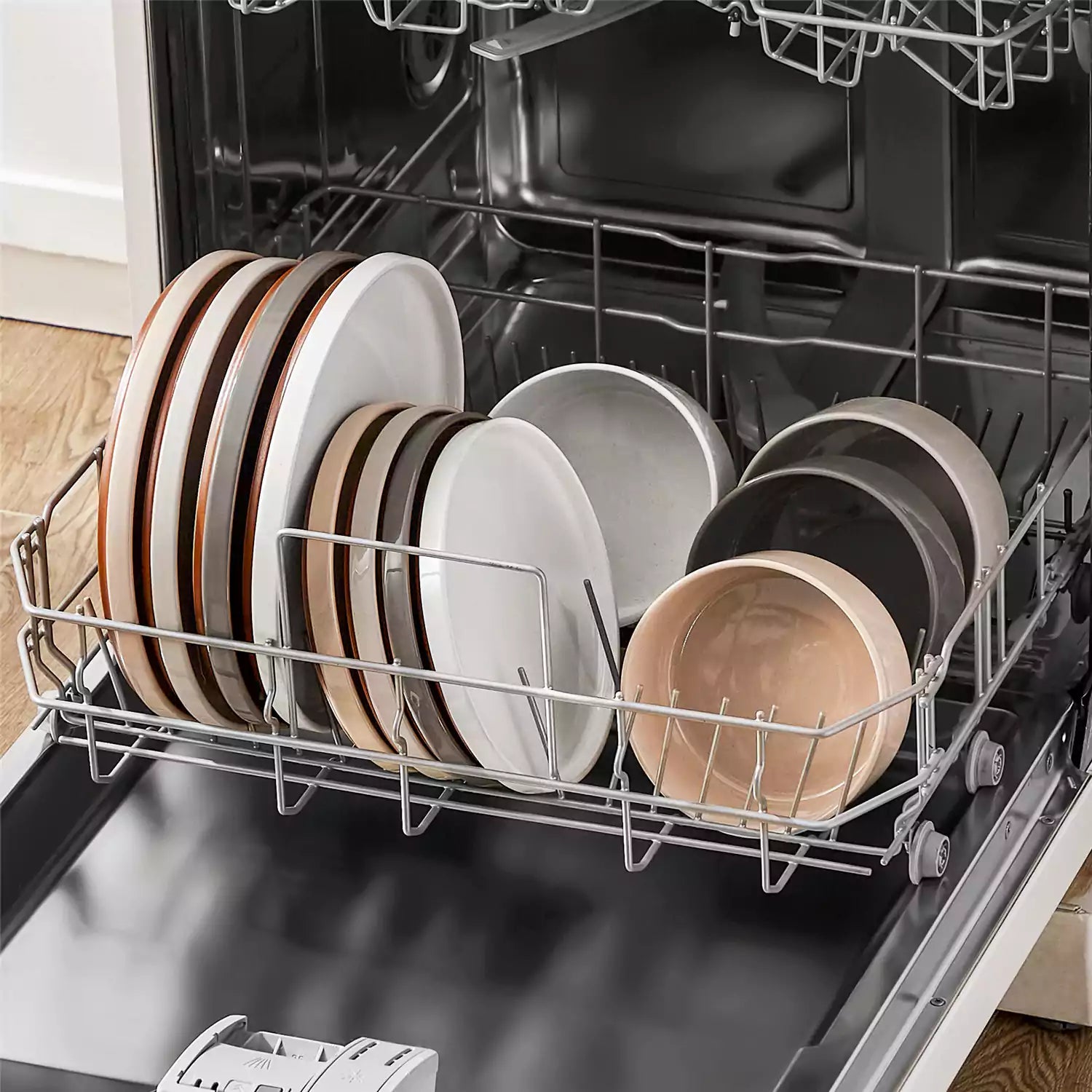 Dishwasher with a rack holding beige plates and bowls.