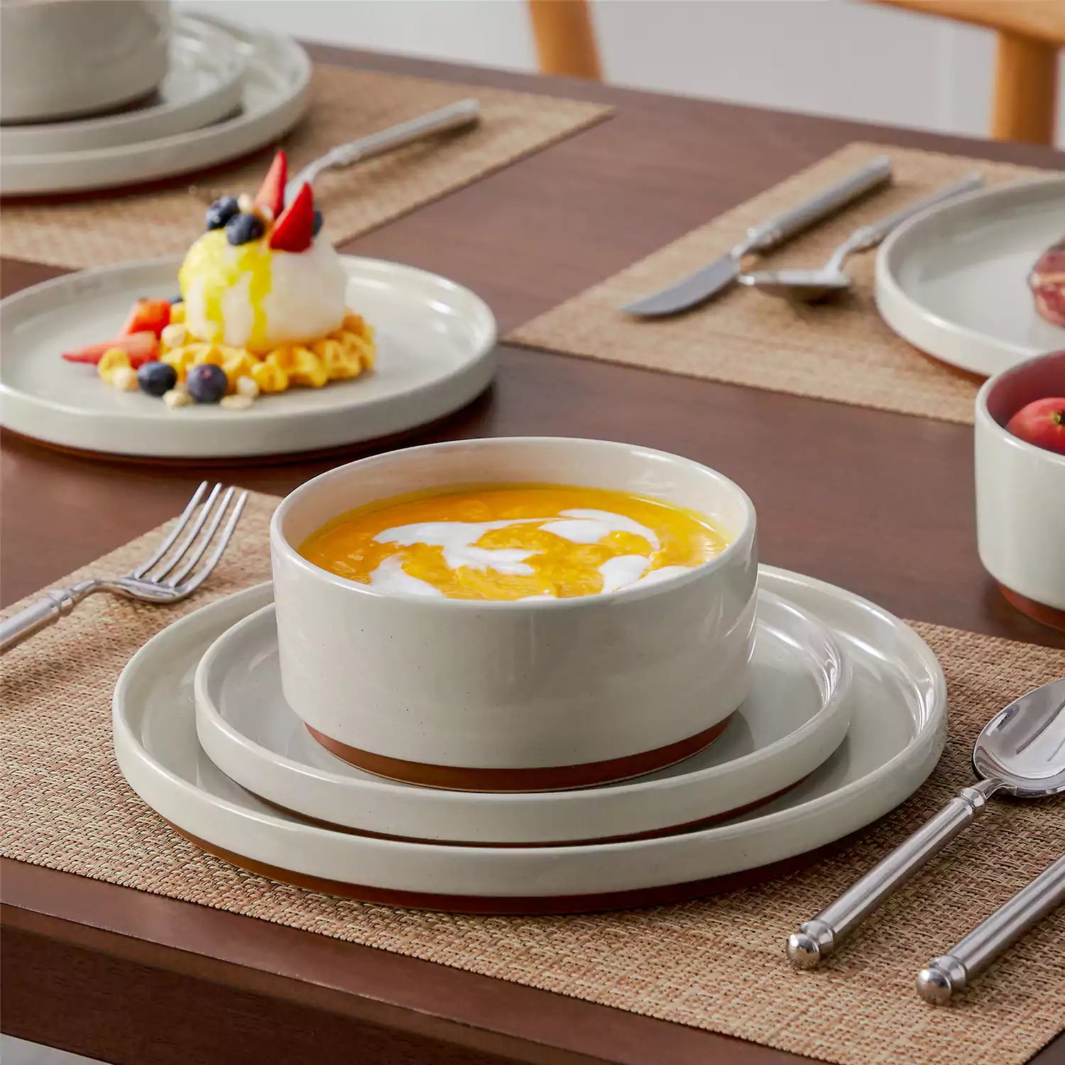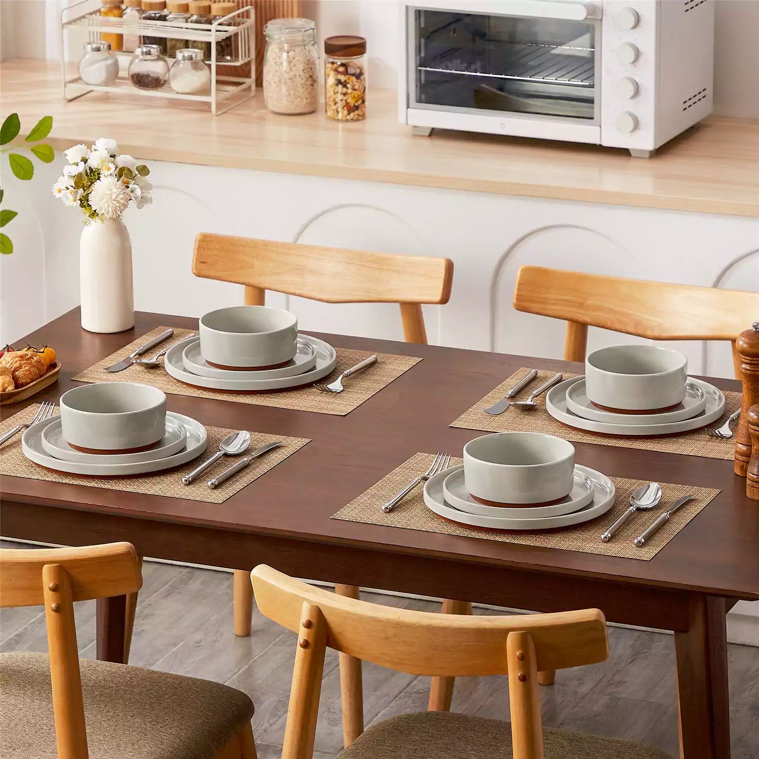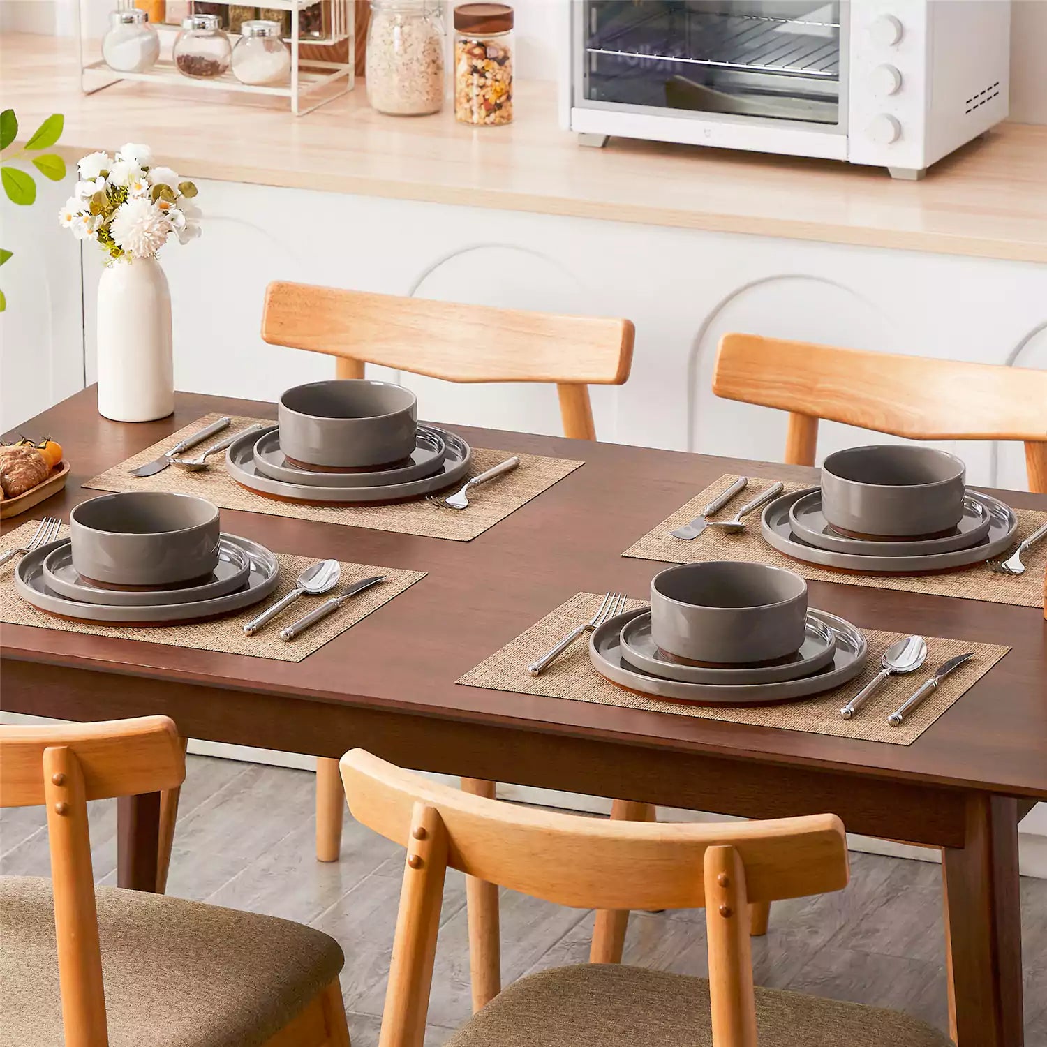 Dining table set with stoneware bowls, plates, and cutlery in a kitchen.