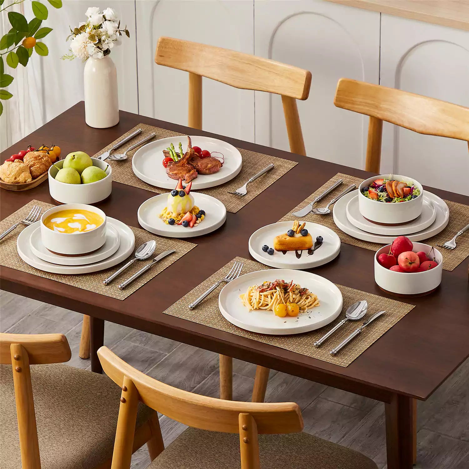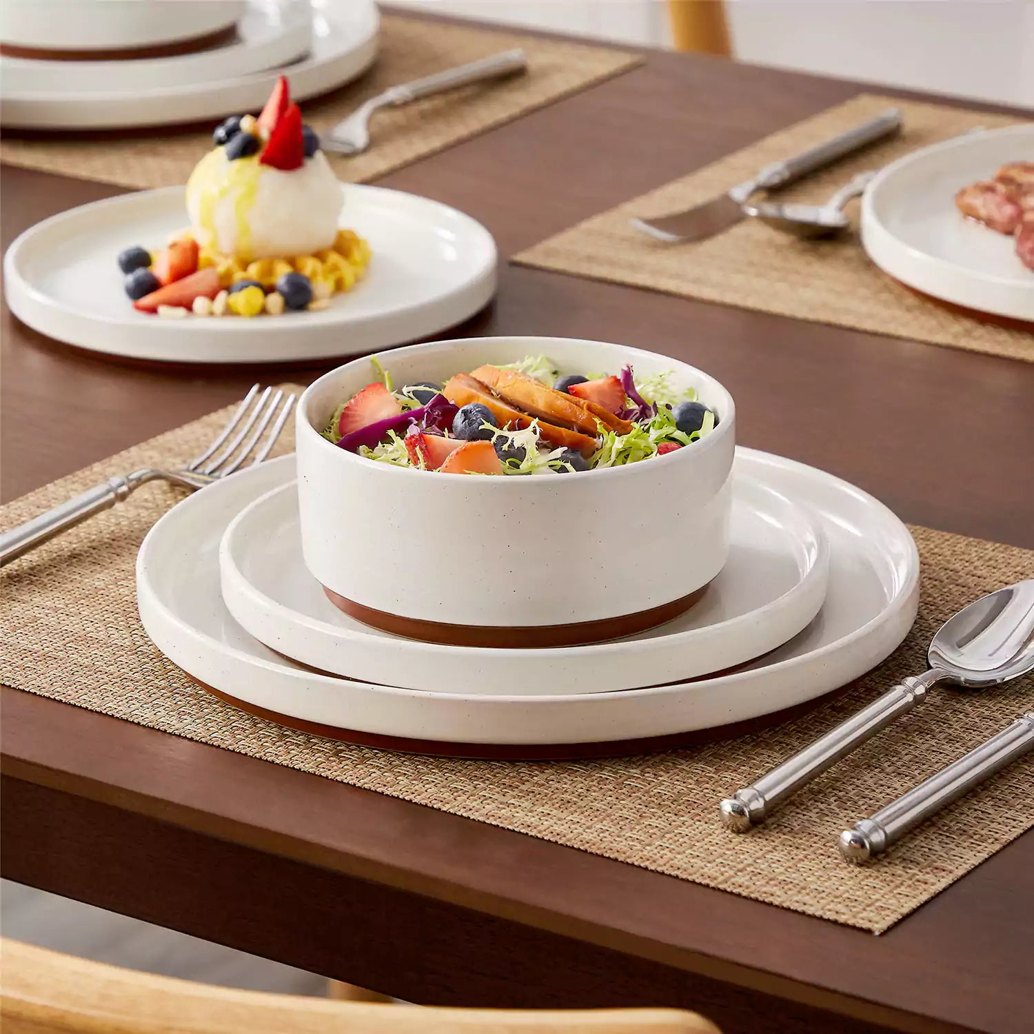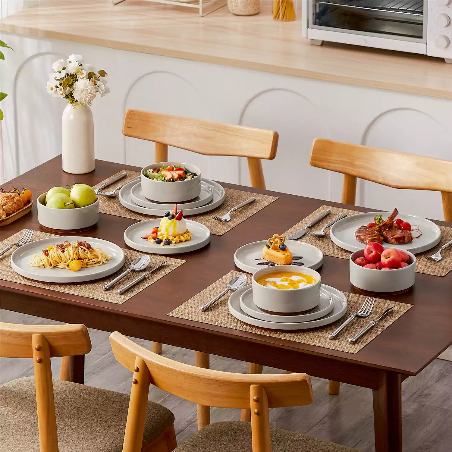 Dining table set with stoneware bowls, plates, and cutlery in a kitchen.