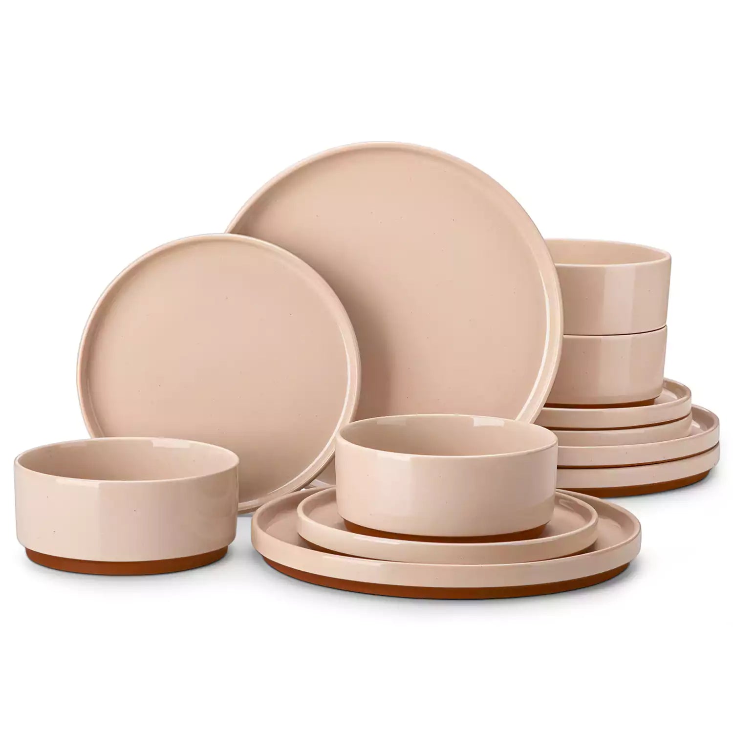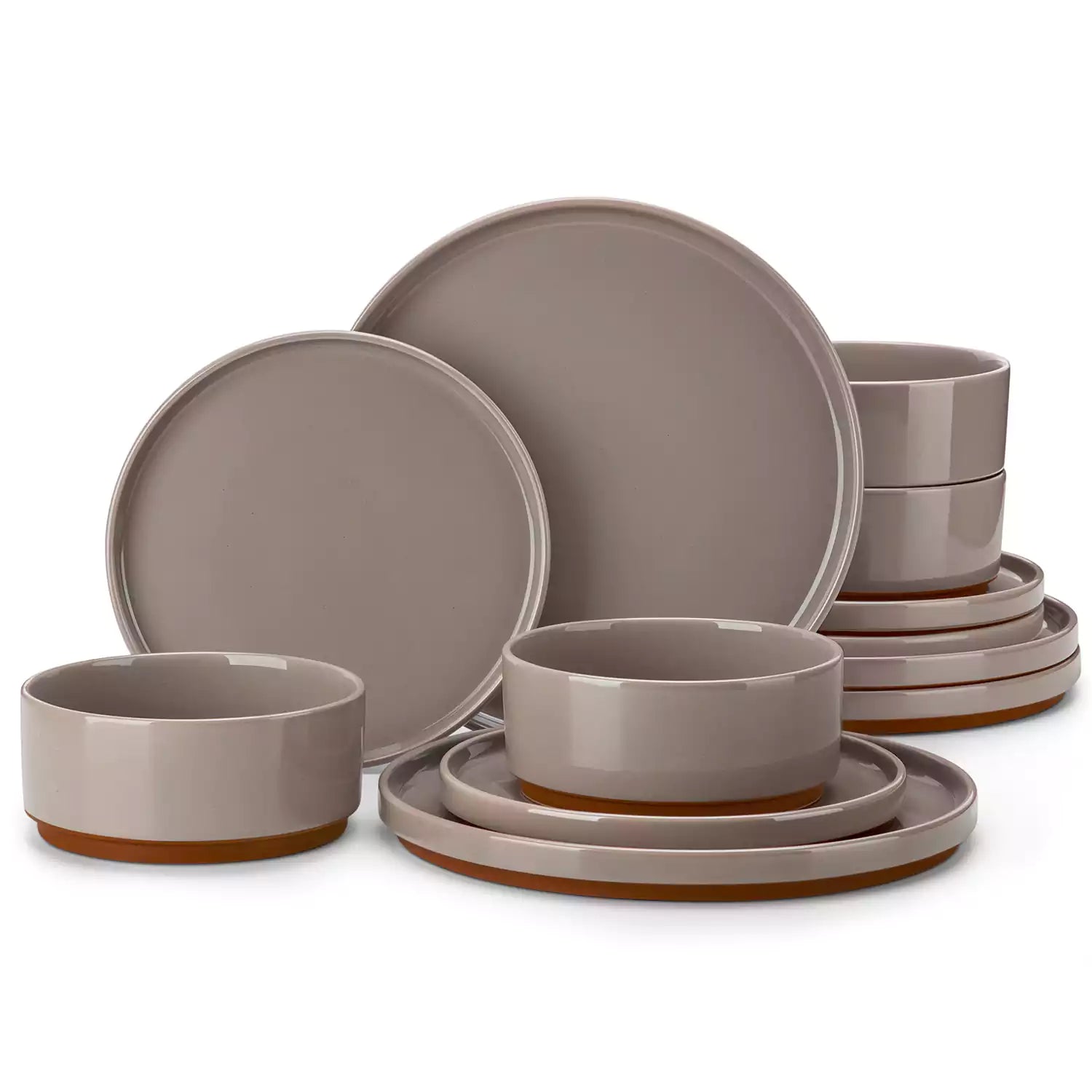 Set of brown stoneware dinnerware including plates and bowls on a white background