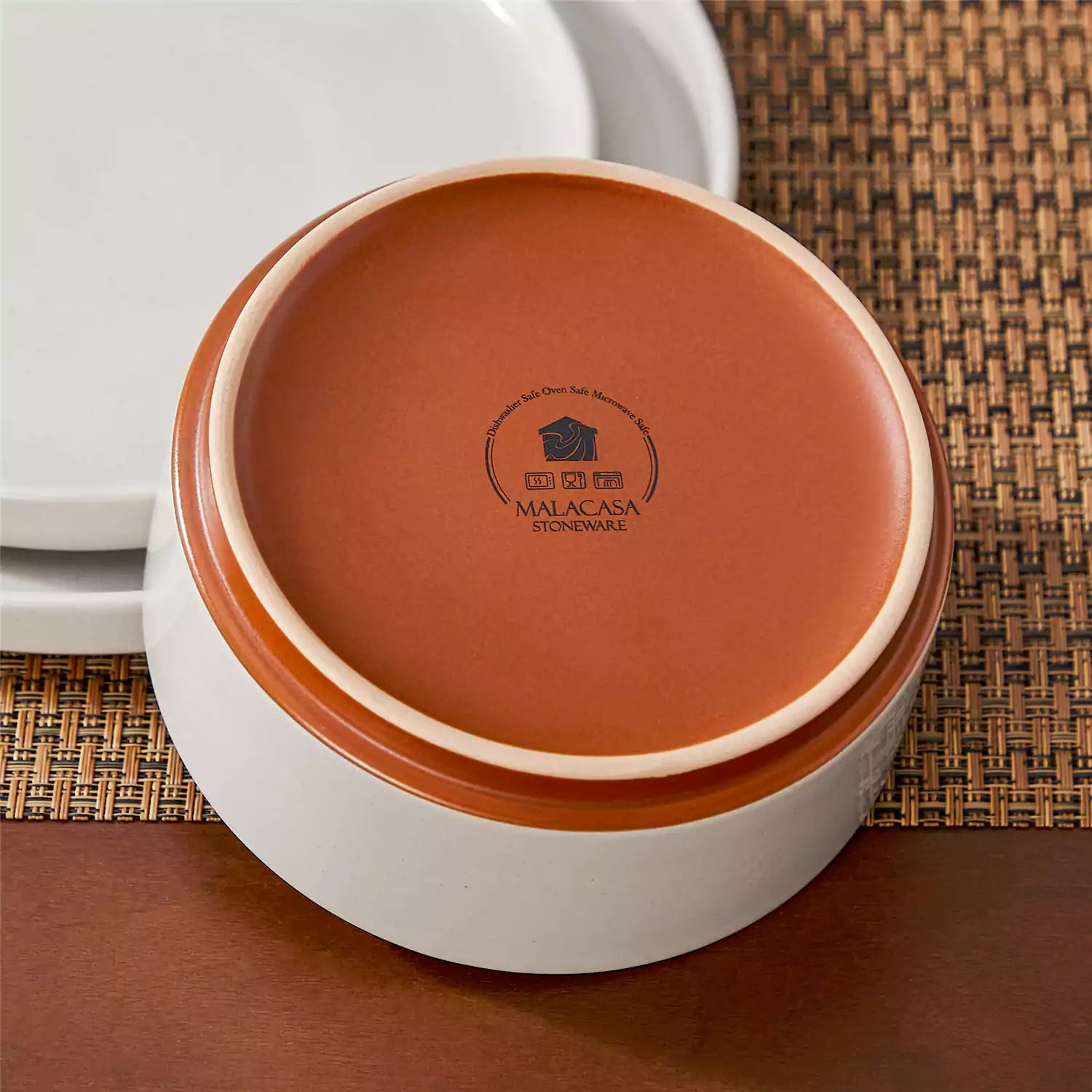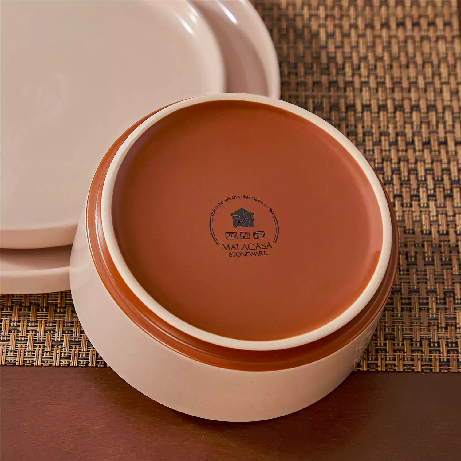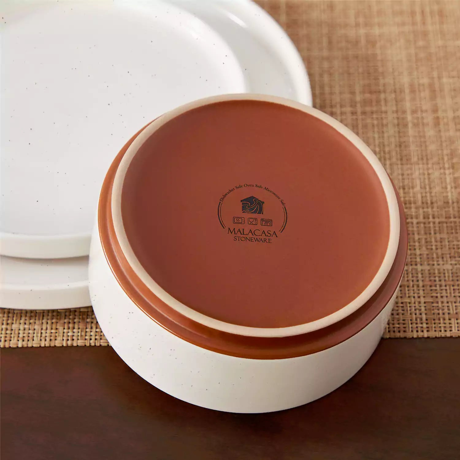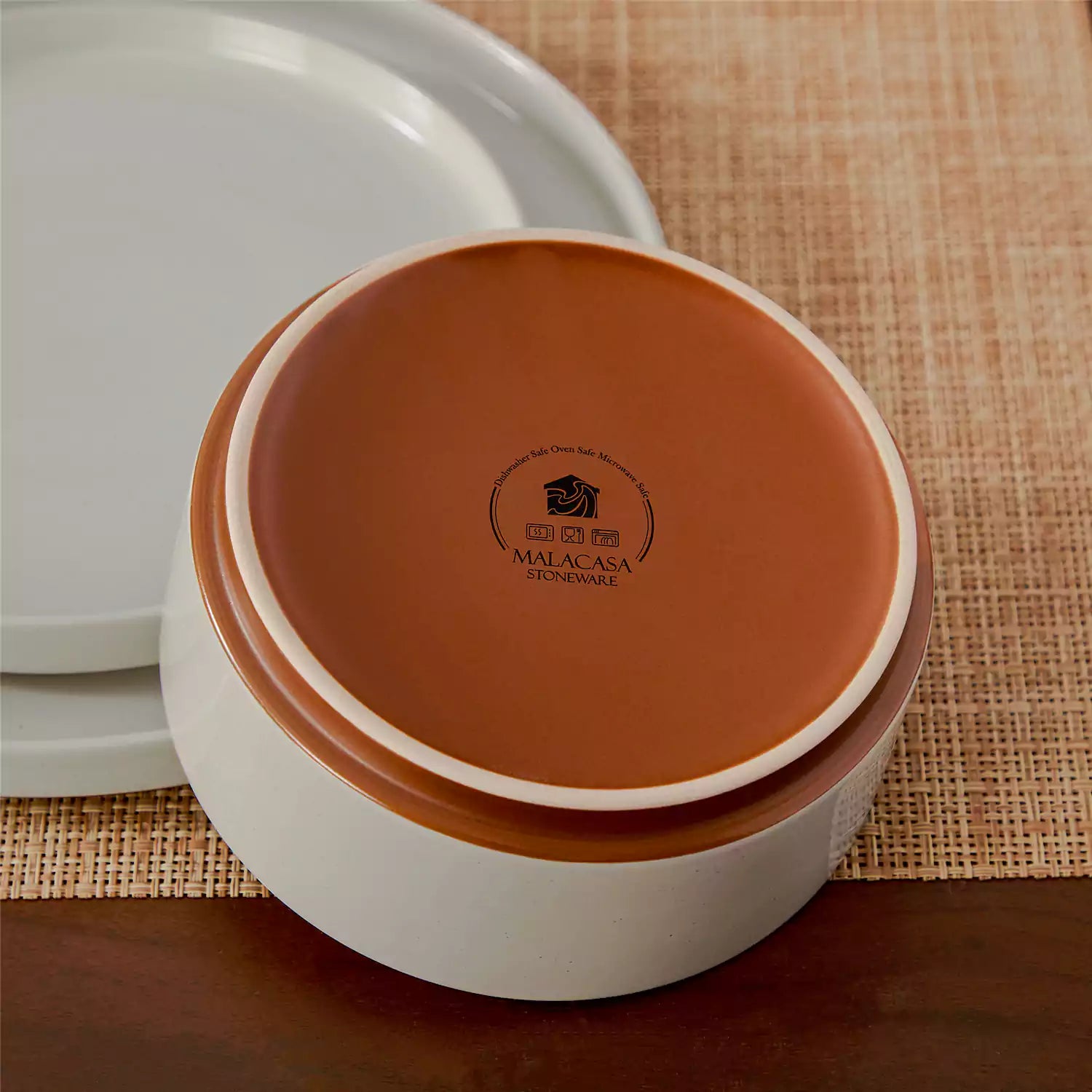 stoneware dish with Malacasa logo on a woven mat background
