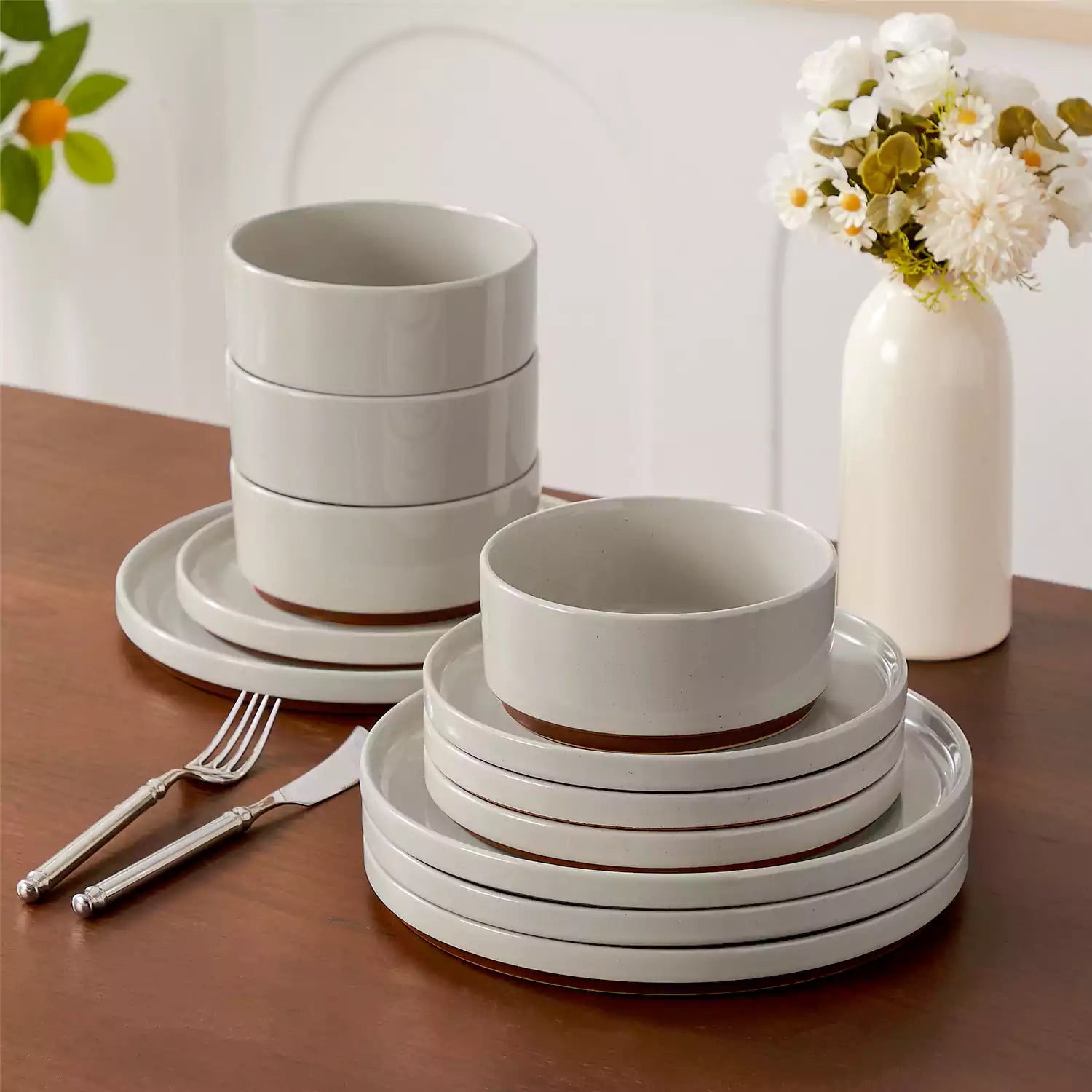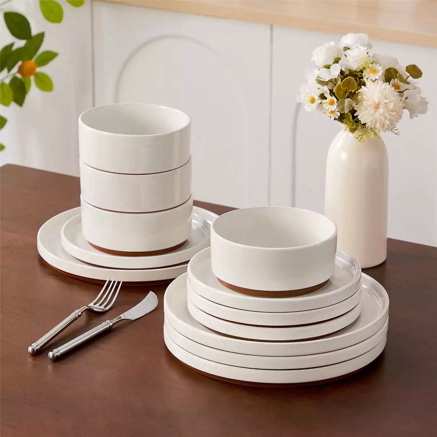 Set of white stoneware  dishes on a wooden table with a vase of flowers in the background.
