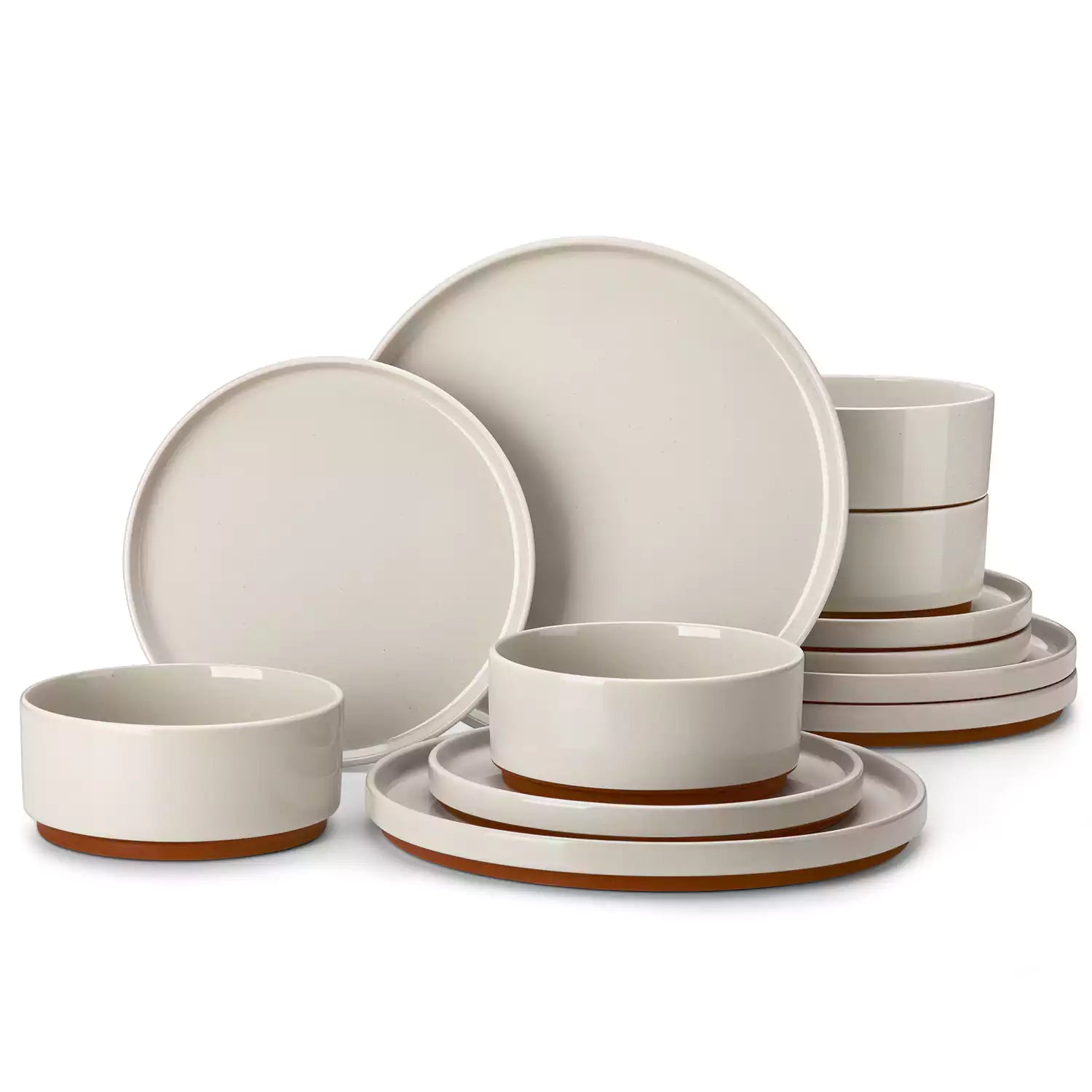 Set of white stoneware dinnerware with brown accents on a white background#color_white