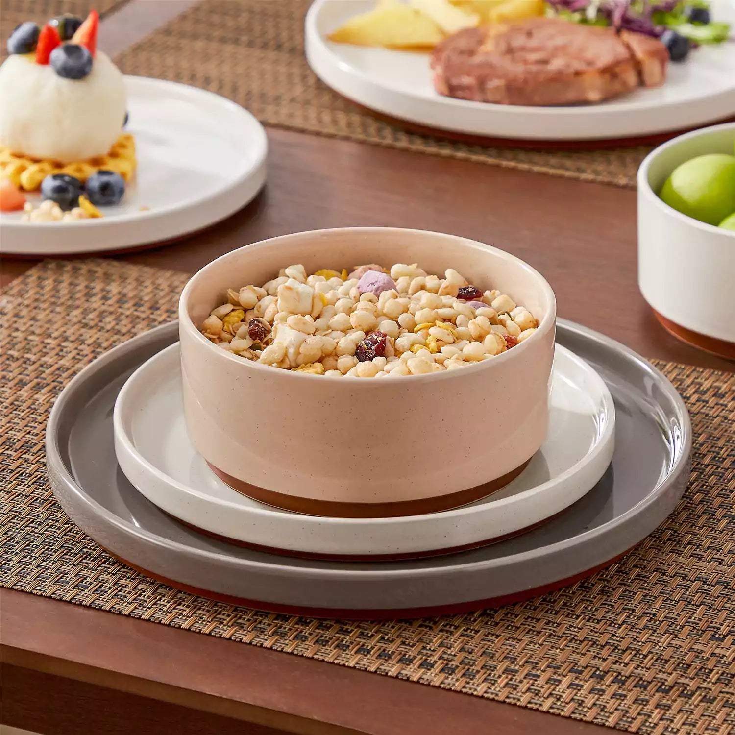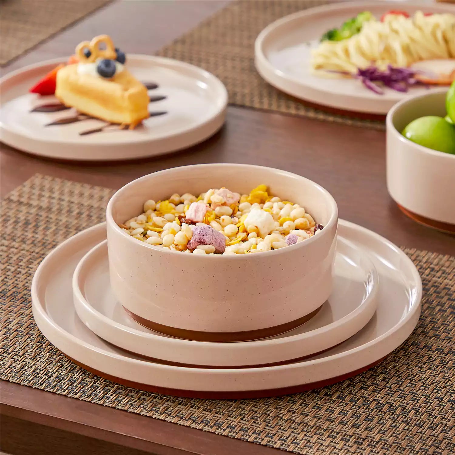 Bowl of cereal on a stack of plates with a dessert and other food items in the background.