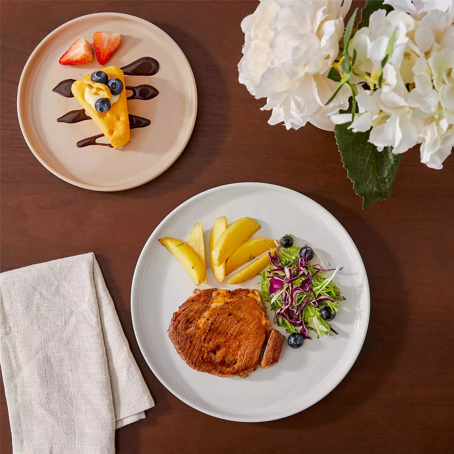 Two plates of food on a wooden table with flowers and a napkin.