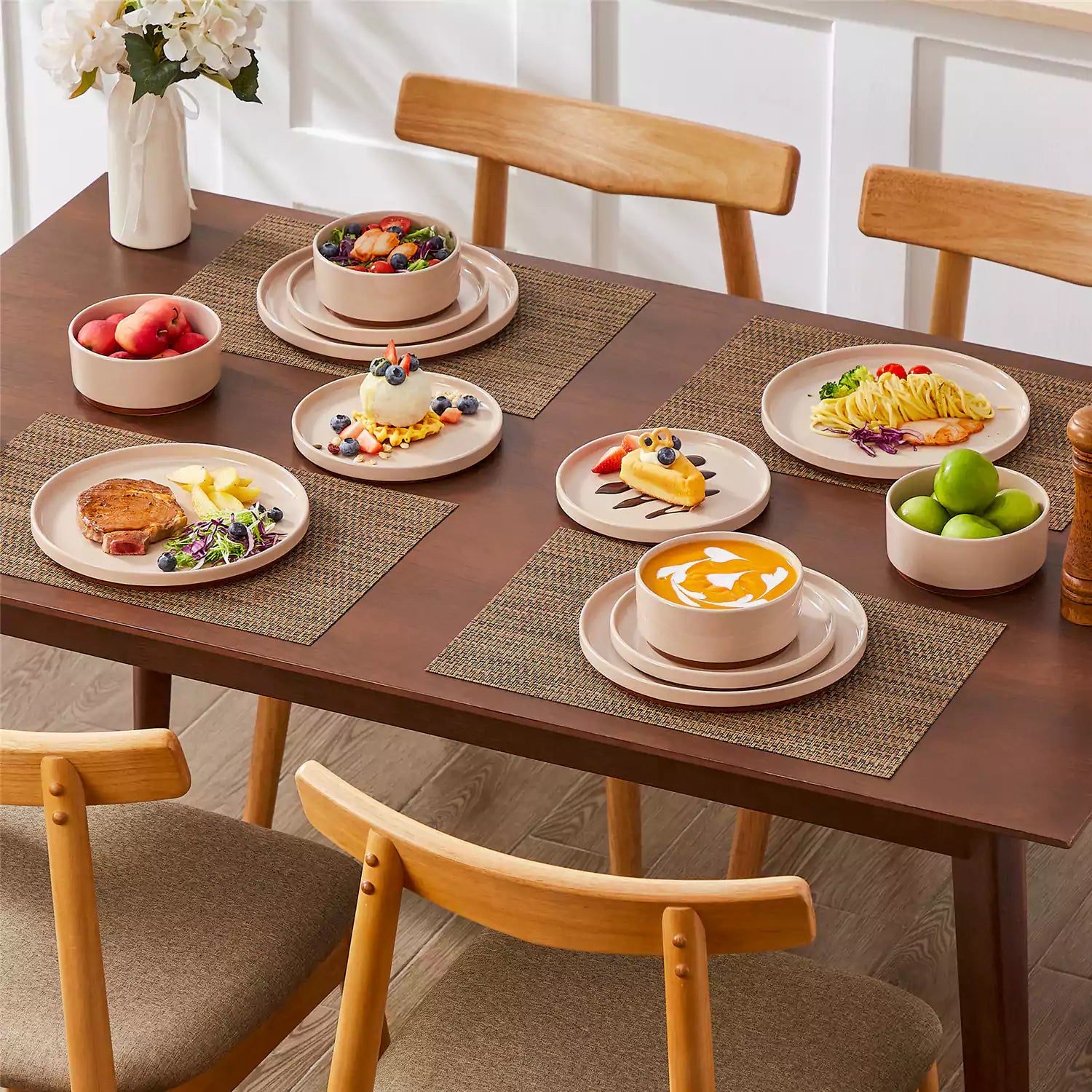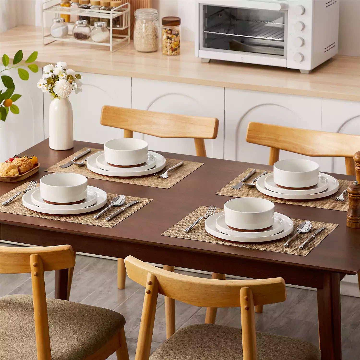 Dining table set with brown stoneware bowls and wooden chairs in a kitchen.