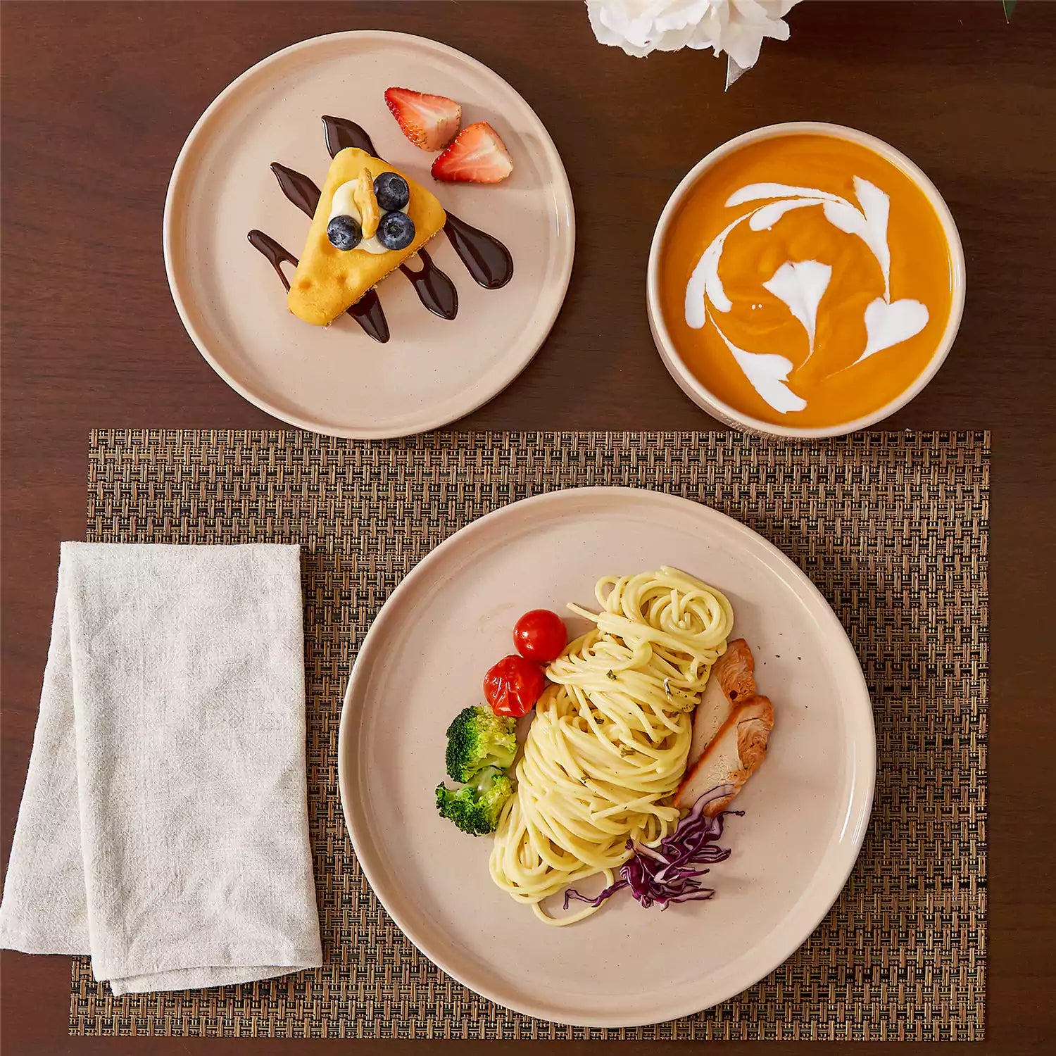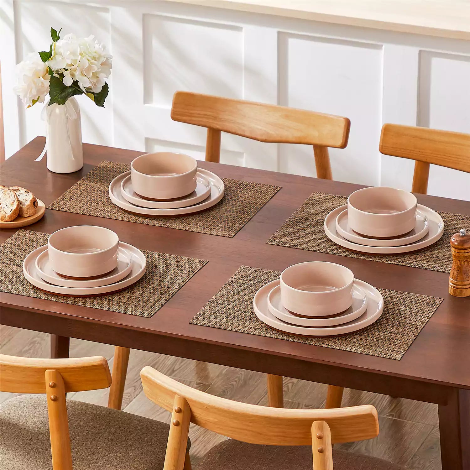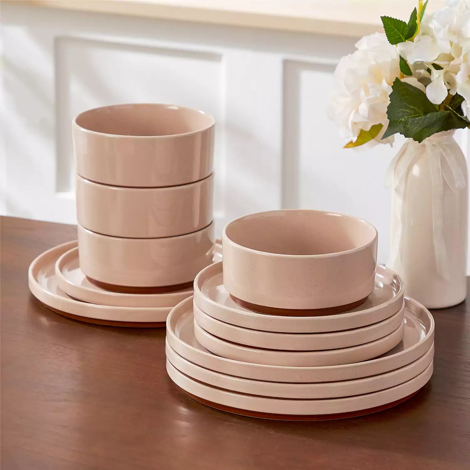 Set of pink stoneware dishes on a wooden table with a vase of flowers in the background.