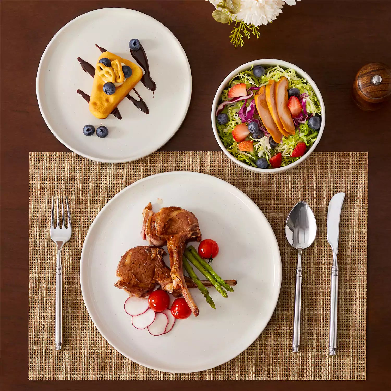 Dinner setting with two plates of food, a bowl of soup, and cutlery on a placemat.