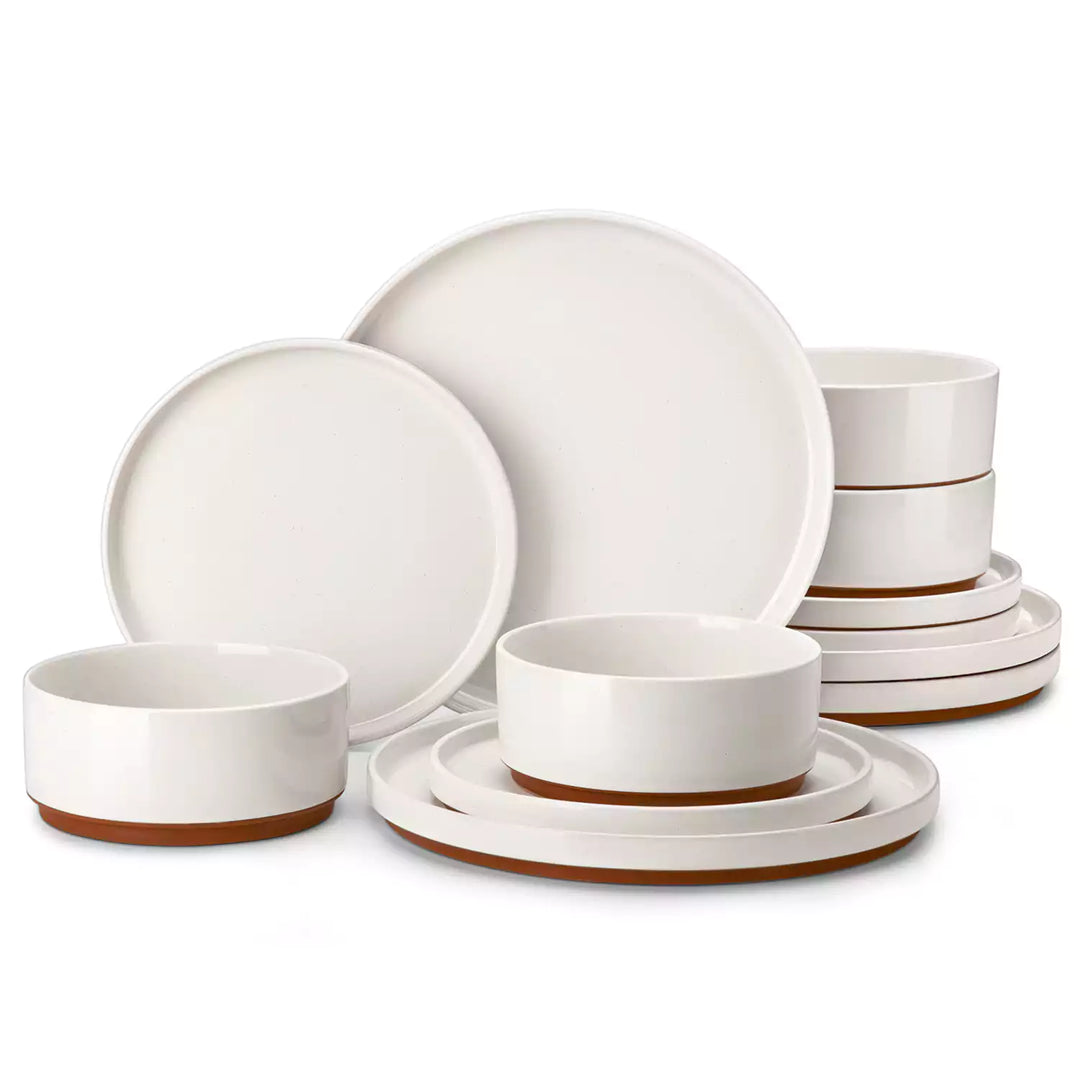 En la mesa, el juego de loza LEAH se siente silenciosamente moderno y cómodamente familiar. Los platos redondeados y los cuencos de lados rectos crean un aspecto limpio y equilibrado, suavizado por un esmalte de sésamo moteado y una base de color arcilla mate. Terminado en blanco marfil y selectas combinaciones de colores, el juego añade un contraste sutil sin abrumar la mesa. Diseñado para apilarse fácilmente y fabricado con duradera loza, estas piezas cotidianas se sienten fáciles de usar. El juego de 12 piezas LEAH incluye platos para la cena, platos para postre y cuencos para cereales, con ligeras variaciones en el esmalte que le dan a cada pieza una sensación de uso.
