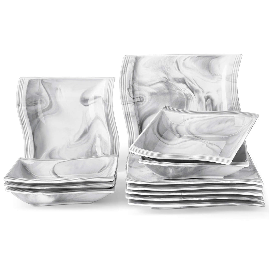 Este juego de 12 piezas es ideal para las comidas diarias o para pequeñas reuniones, ya que cuenta con 6 platos llanos y 6 platos hondos con elegantes detalles de bordes ondulados y acentos geométricos. Disponible en blanco marfil o gris mármol, aporta un toque moderno a cualquier mesa. Fabricado en porcelana duradera, es apto para microondas y lavavajillas, lo que ofrece estilo y comodidad para cualquier comida.