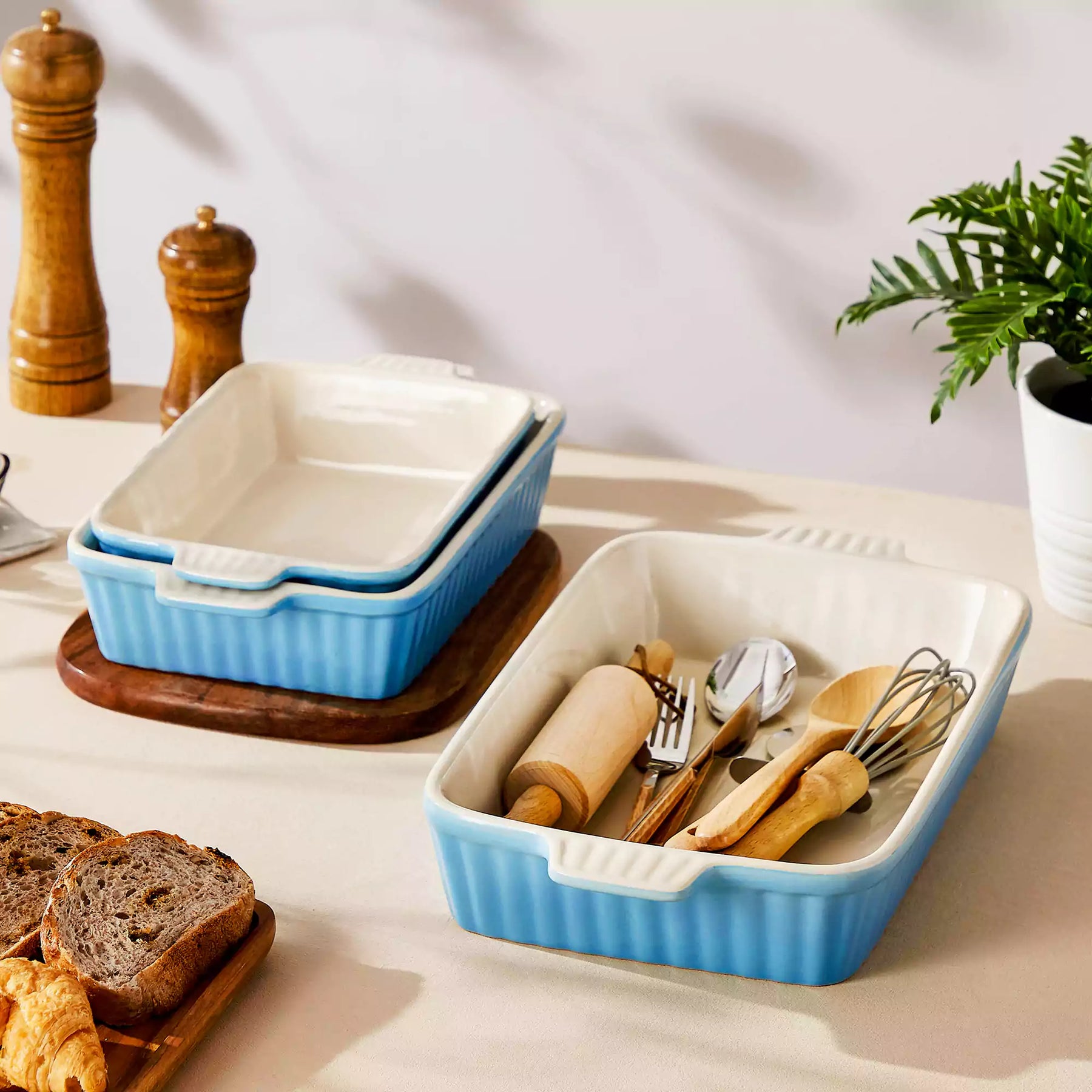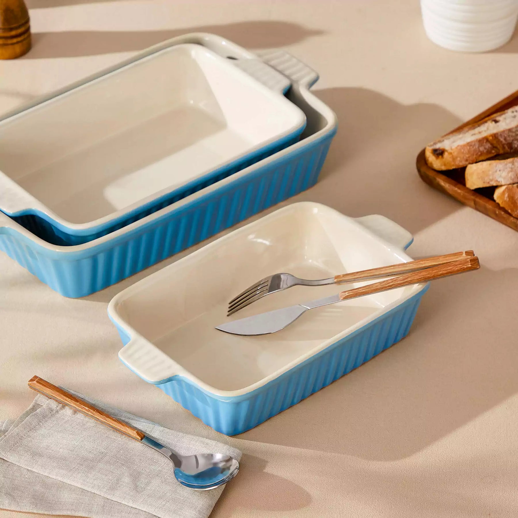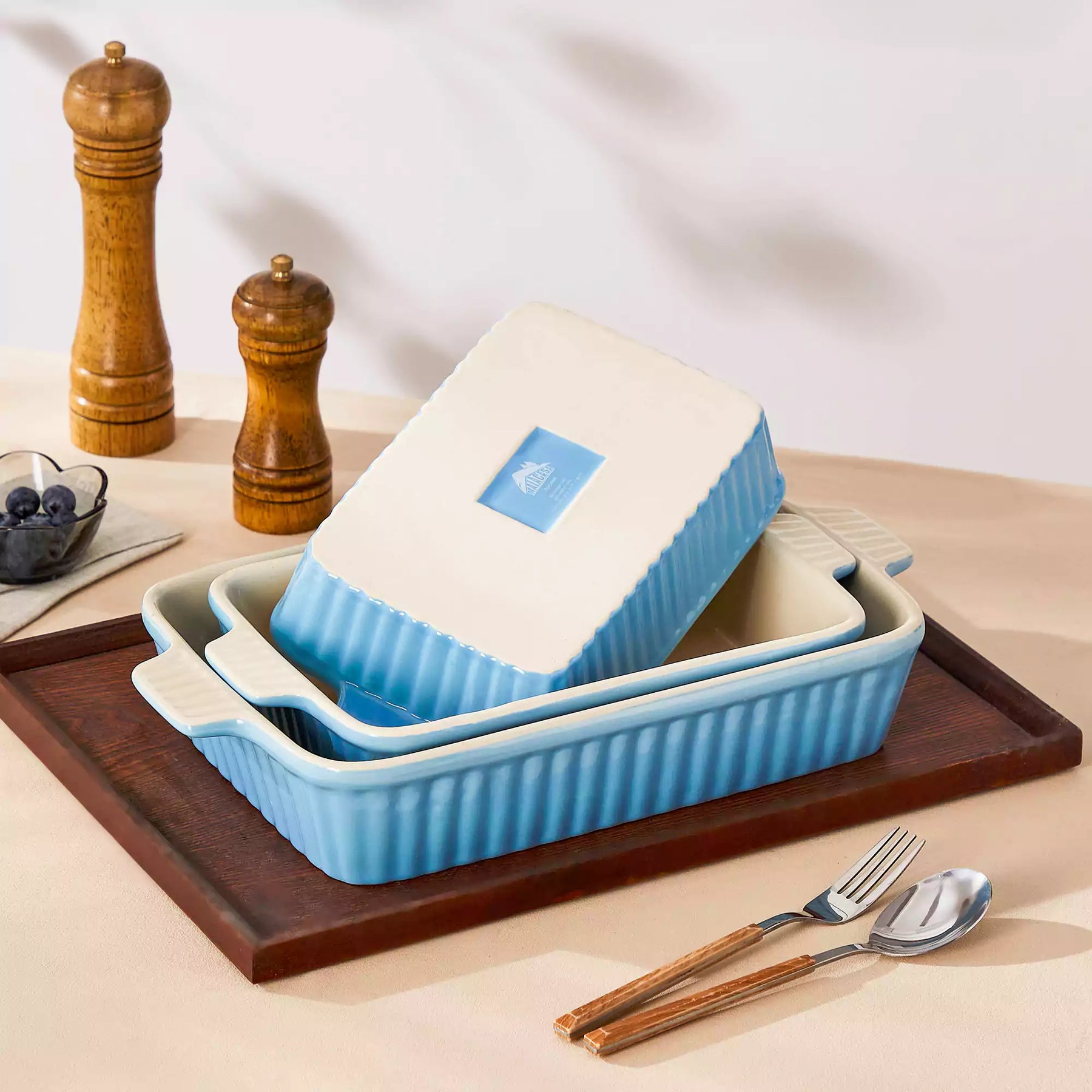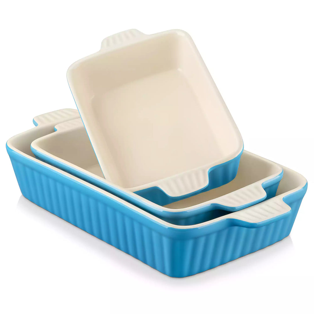 Propre, simple et conçu pour la cuisine quotidienne, cet ensemble de plats à cuisson en porcelaine associe un extérieur bleu brillant à un intérieur blanc crémeux. L'ensemble comprend trois tailles polyvalentes—14,7″, 12,2″ et 11,1″—adaptées aux besoins de cuisson courants, des casseroles familiales aux accompagnements plus petits. L'extérieur à cannelures verticales ajoute de la texture, et les poignées robustes assurent un transport sûr et confortable du four à la table. Fabriqués en porcelaine durable, les pièces s'empilent facilement et sont compatibles avec le four, le micro-ondes et le lave-vaisselle, s'intégrant aisément dans les repas quotidiens.