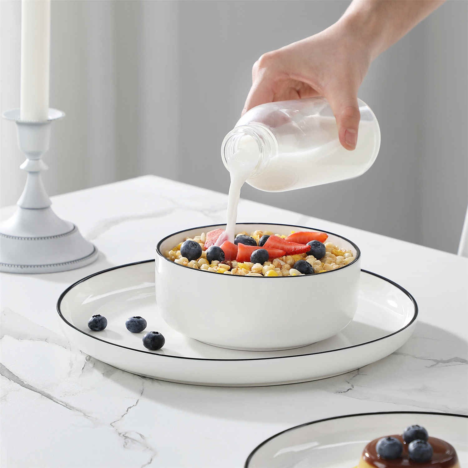 Entrez dans la sophistication moderne avec cet ensemble de vaisselle convoité, défini par son design élégant à bords surélevés et proposé dans une palette raffinée—blanc ivoire classique, ivoire élégant bordé de noir, et des teintes marbrées de gris, bleu et rose. Cette collection en porcelaine durable pour huit personnes comprend des assiettes à dîner, des assiettes à dessert et des bols à céréales. Compatible avec le lave-vaisselle, le micro-ondes et le four, elle allie style contemporain et praticité intemporelle pour un usage quotidien.