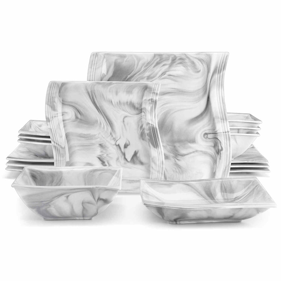 Cet ensemble de 16 pièces comprend des assiettes plates, des assiettes à salade, des assiettes à soupe et des bols à céréales. Son design ondulé et ses accents géométriques ajoutent une touche moderne, disponible en blanc ivoire ou gris marbre. Fabriqué en porcelaine durable, il passe au micro-ondes, au four et au lave-vaisselle, alliant style et praticité pour les repas quotidiens ou les réunions décontractées.