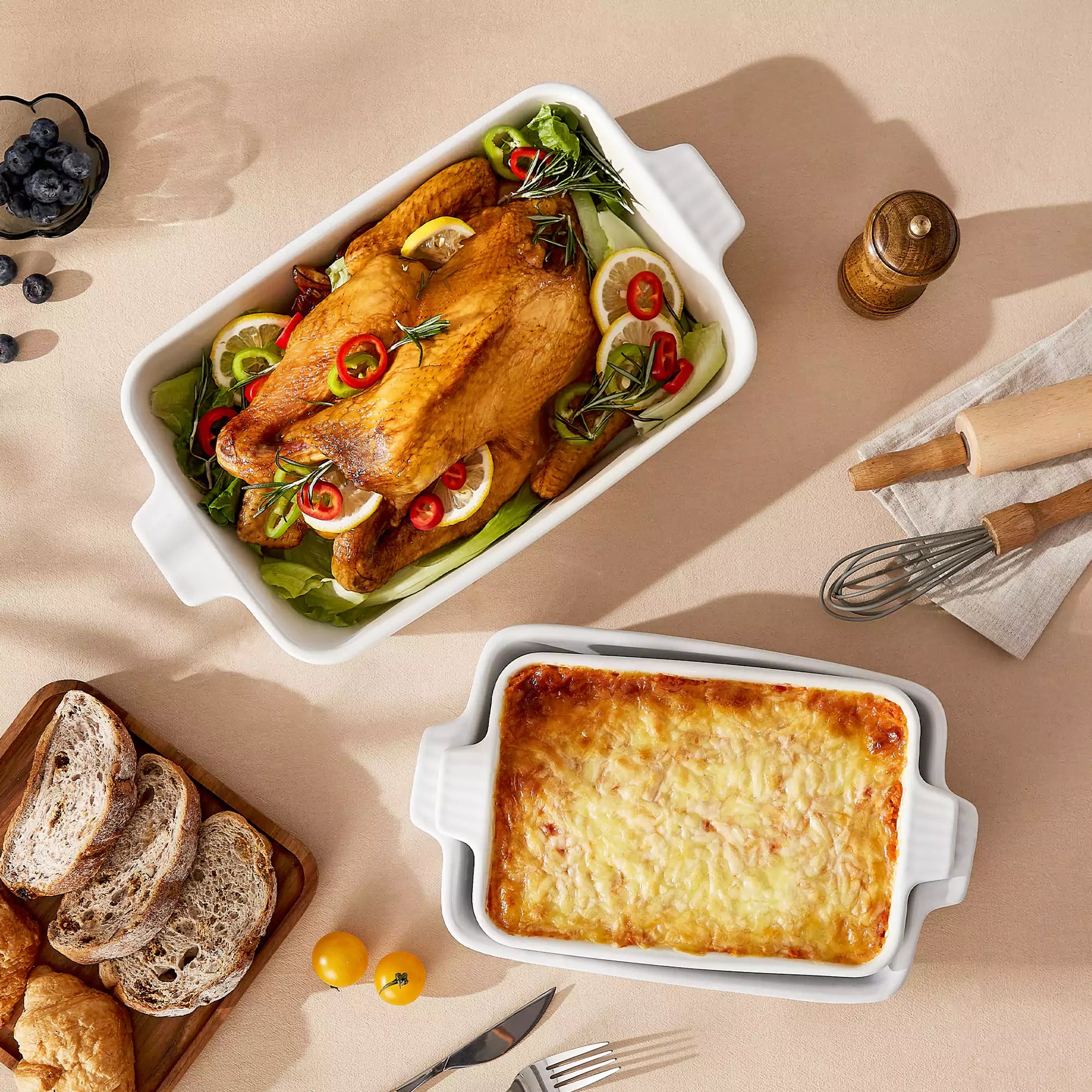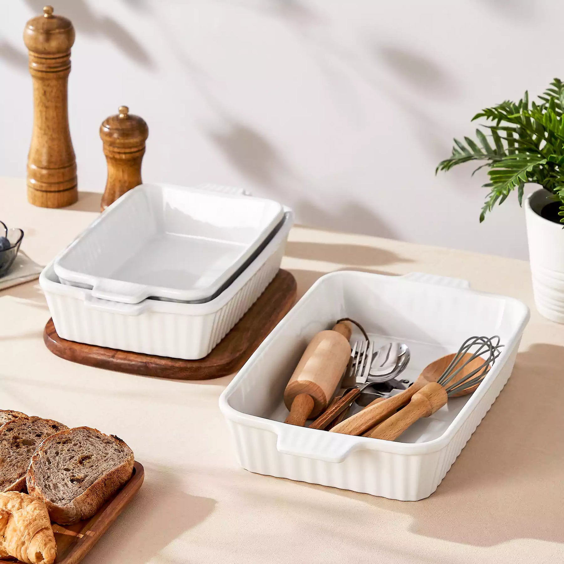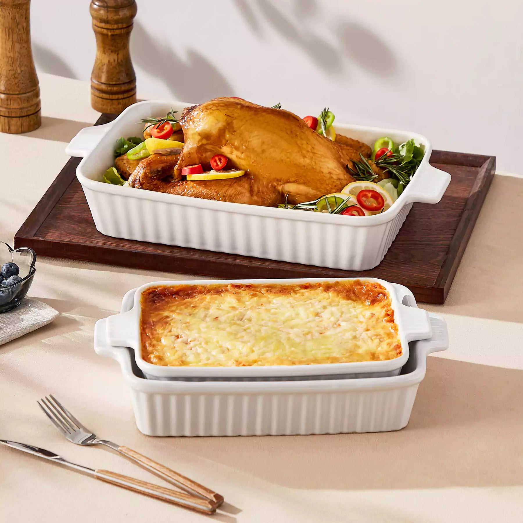 Che tu stia servendo un accogliente brunch domenicale o preparando una semplice cena in settimana, questo set da forno in porcellana bianca a tre pezzi porta facilità ed eleganza discreta sulla tavola. Selezionato con cura in tre dimensioni versatili—14,7″, 12,2″ e 11,1″—i piatti impilabili sono progettati per adattarsi naturalmente alla cucina quotidiana. L'esterno verticale scanalato aggiunge una sottile texture, e le robuste maniglie a linguetta garantiscono un trasporto sicuro e confortevole dal forno alla tavola. La porcellana durevole si impila ordinatamente ed è sicura per forno, microonde e lavastoviglie.