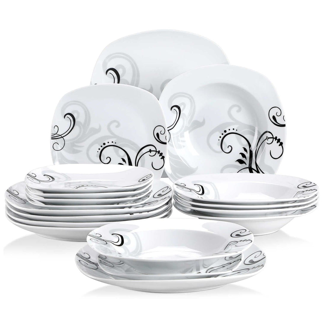 • Servizio stoviglie quadrato in porcellana fine, servizio per 6 persone, motivo decalcomanie nere