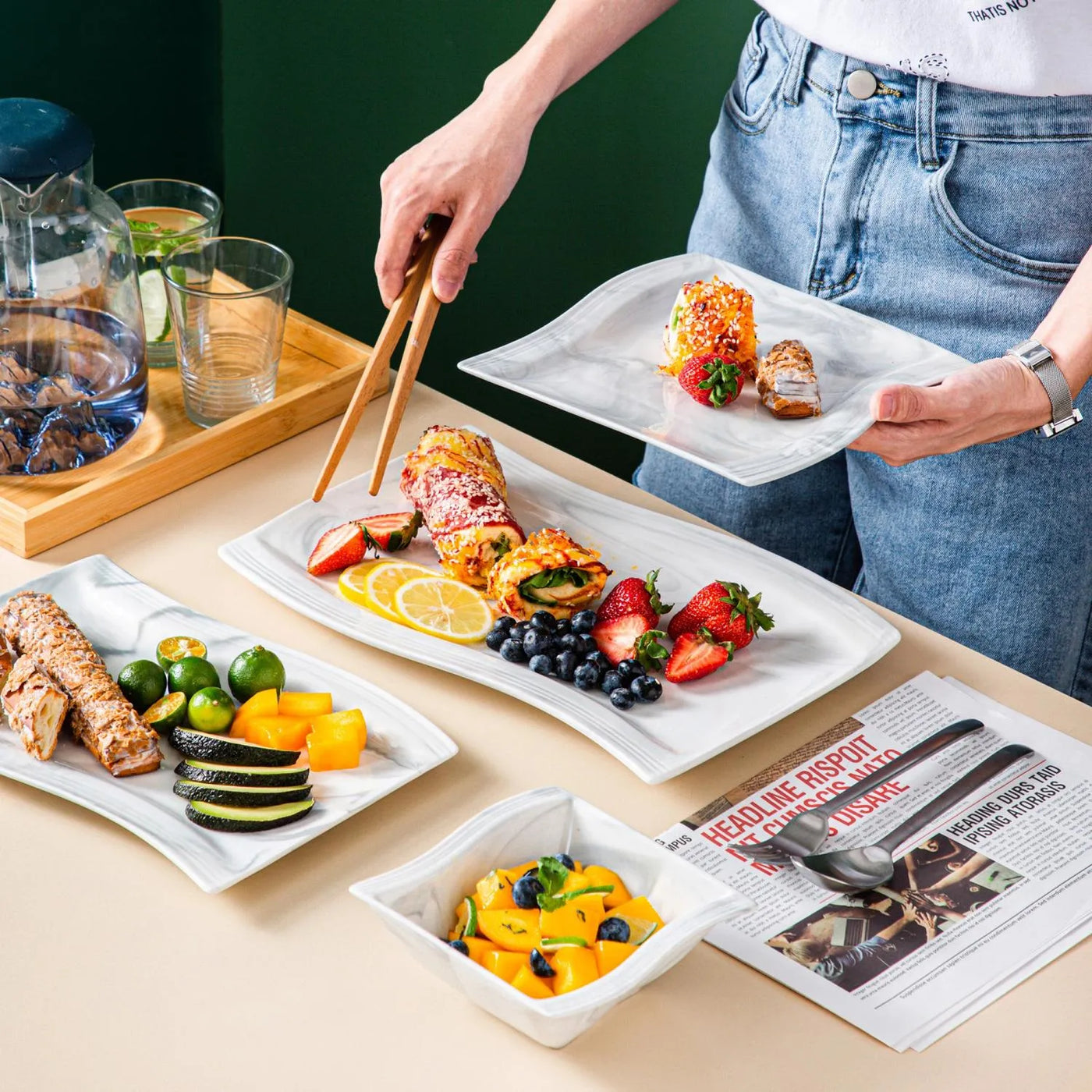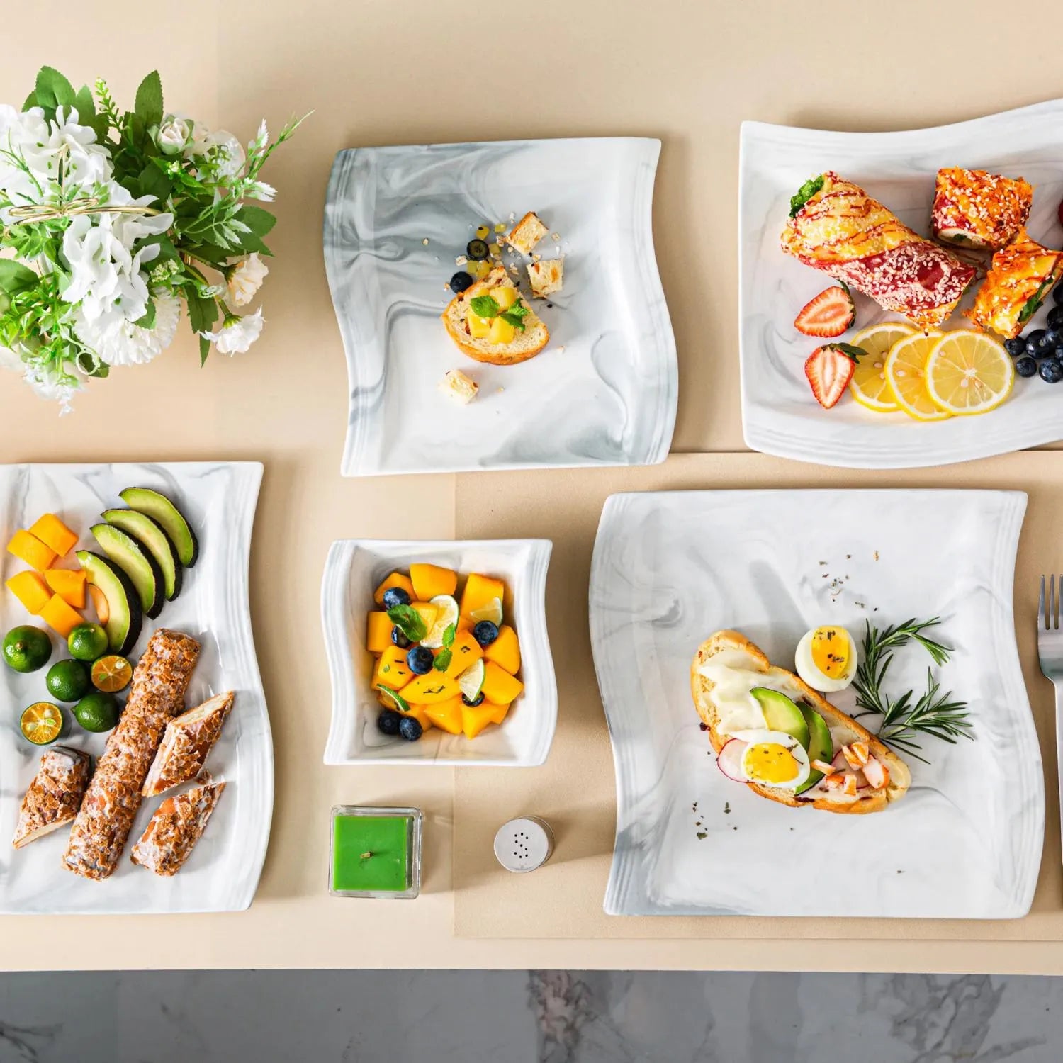 The Flora 26-Piece Set blends elegance and functionality, crafted from premium porcelain in ivory white or marble-inspired grey, blue, and pink. Its square wavy shape and geometric design create a sleek, modern aesthetic. Serving six, the set includes dinner plates, salad plates, soup plates, cereal bowls, and two versatile serving dishes. Durable and stackable for easy storage, it’s microwave, oven, and dishwasher safe. Inspired by blooming flowers, Flora brings a fresh, contemporary touch to everyday meals or special occasions.
