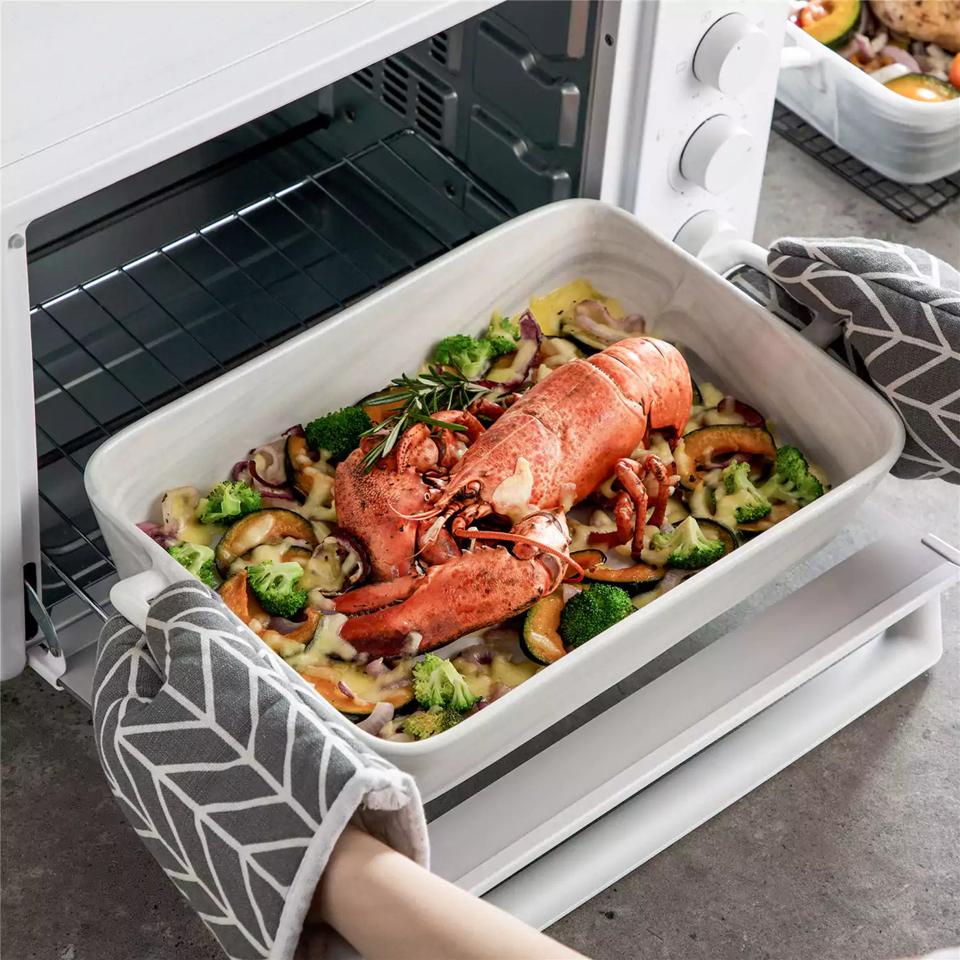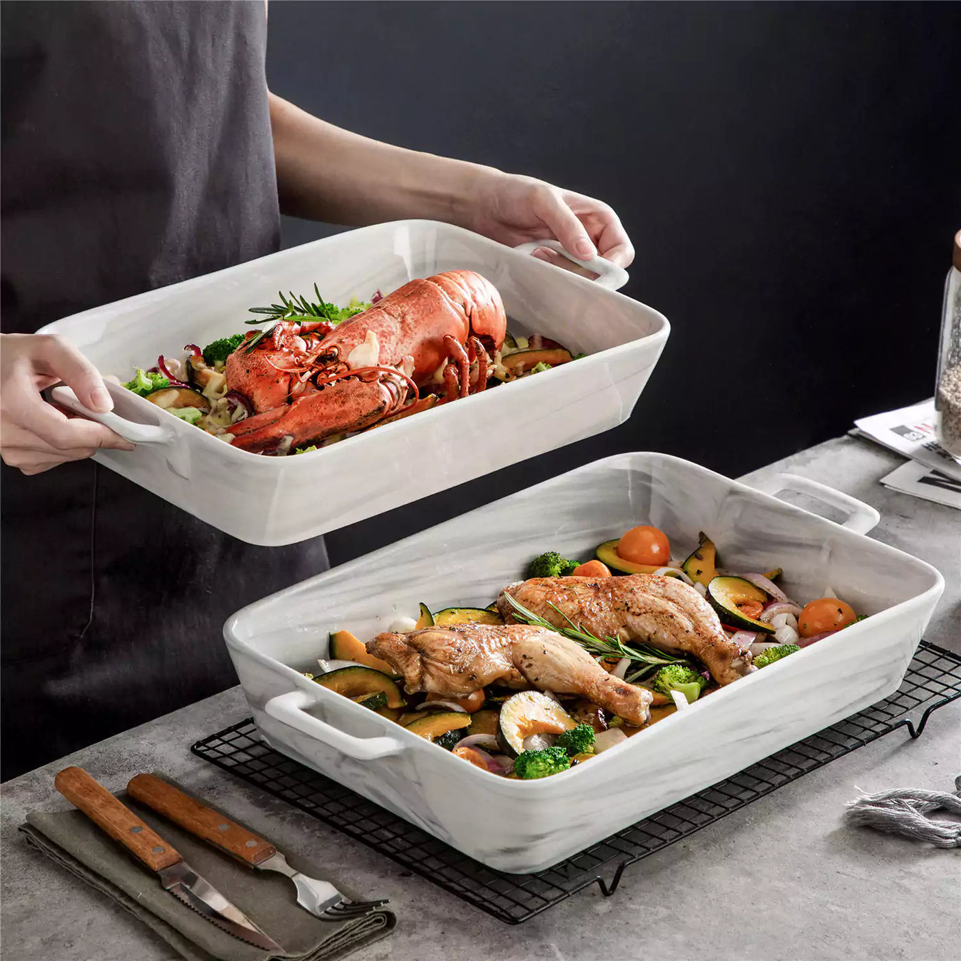 Handled marble grey porcelain baking dishes filled with roasted chicken and seafood
