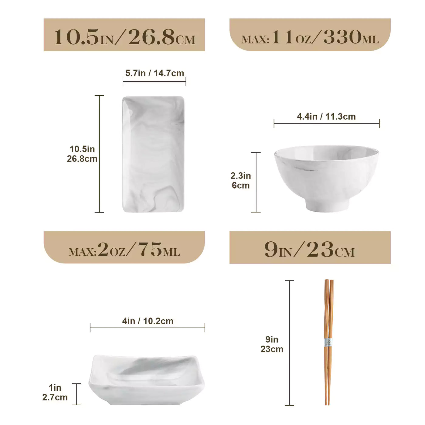 2 rice bowls: 4.4" (11.3cm)