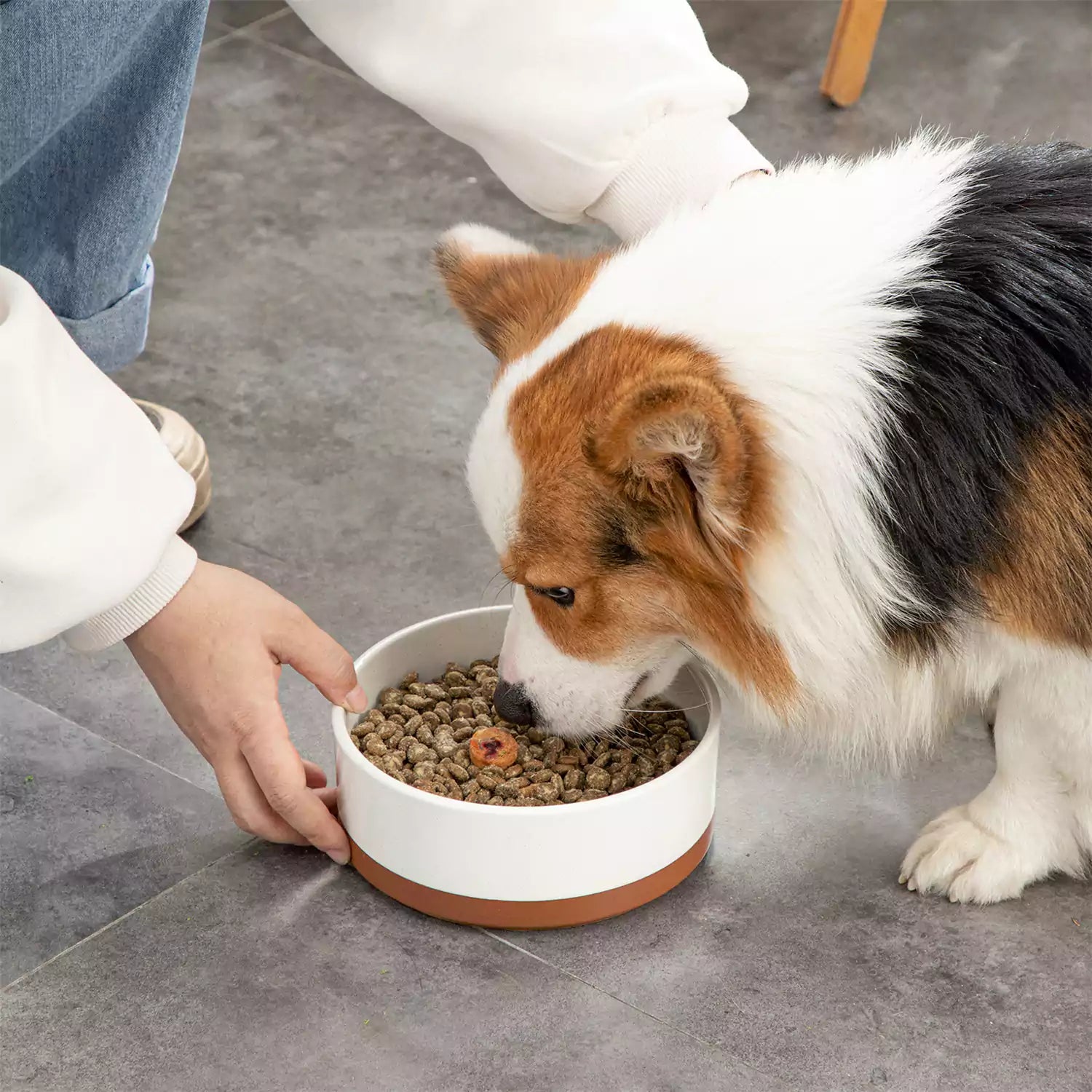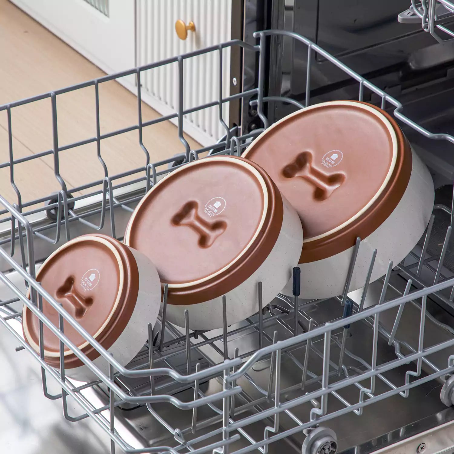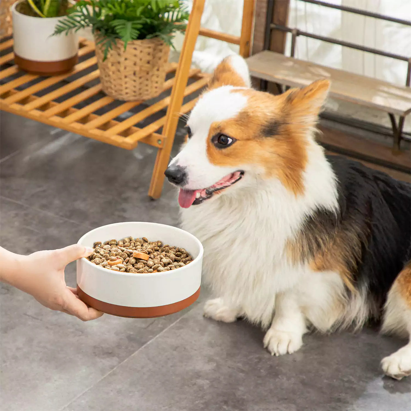 Versatile Tara Dog Bowls with speckled glaze weighted base and bone-shaped cut-out - 8 inch